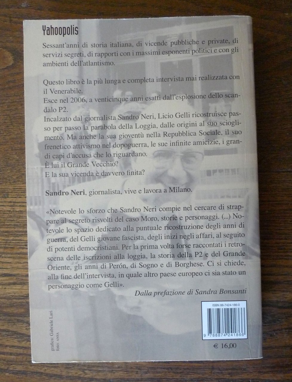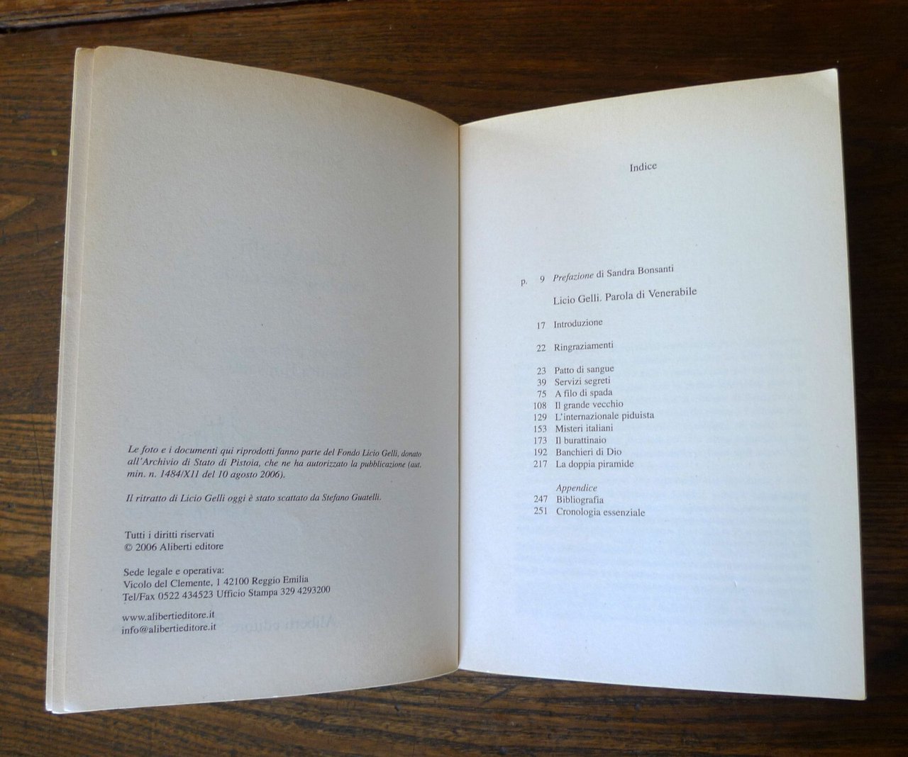 Sandro Neri,LICIO GELLI.PAROLA DI VENERABILE.Prefazione di Sandra Bonsanti.Aliberti Editore, Reggio Emilia 2006, seconda edizione,brossura, 21x14 cm., pp.255,illustrazioni fotografiche su tavole in carta patinata fuori testo,collana YAHOOPOLIS,ISBN: 88-7424-186-0,peso: g.450cod.9289CONDIZIONI DEL LIBRO: molto buone,firma al frontespizio,pagine leggermente ingiallite