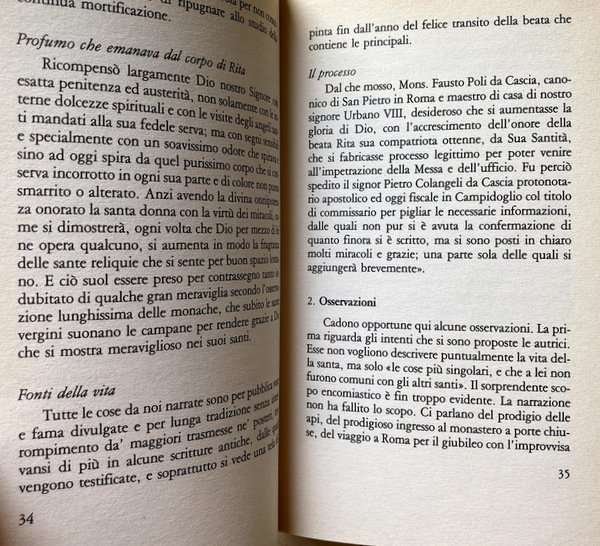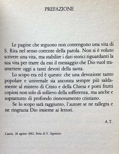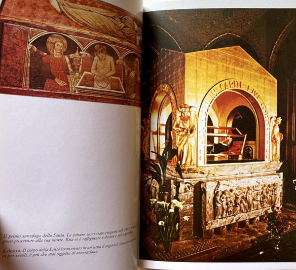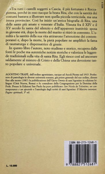 Soggetti: Religione, Spiritualità, Figure religiose e spirituali, Santi, Beate, Donne, Sante, Agiografie, Biografie, Storia, Messaggio, Diari, Memorie, Bibliografia, Studi religiosi, Santa Rita Da Cascia, Devozione, Vocazione, Castità, Mitologia, Innamoramento, Maternità, Fede, Grazia, Sofferenza, Solitudine, Abbandono, Aridità spirituale, Misericordia, Cristianesimo, Chiesa, Opere generali, Santa degli impossibili, Processo, Canonizzazione, Misticismo, Teologia cristiana, Voti, Medioevo, Trecento, Quattrocento, Eresie, Eretici, Sant'Agostino, Monachesimo, Ordini monastici, Monache, Libri Vintage Fuori catalogo, Pietà, Miracoli, Taumaturgia, Guarigioni, Classici, Misteri, Leggende, Riti, Culto, Fedeli, Predicazione, Devoti, Codice, Notaio, Religiosità popolare, Sermoni, Città di Dio, Pellegrinaggio, Santuari, Consacrazione, 22 Maggio, Festa, Benedizione, Folklore, Paolo VI, Vita, Fonti storiche, Esegesi, Chiara da Montefalco, Nicola da Tolentino, Stimmate, Atti notarili, Testimonianze processuali, Inno, Cassa solenne, Salve Rita generosa, Croce, Preghiera, Perdono, Operatori di pace, Fratelli, Soli Deo, Spina spes gloriae, 1626, Carlo Alonso Osa, Documenti, Damaso Trapp Osa, Archivio notarile, Rosario Sala, Giacomo Martinacci, Gerardo Bruni, Santità, Roccaporena, Fotografie, Libri illustrati, Iconografia, Immagini, Fontana delle api, Stigma, Morte, Corpo, Profumo, Vangelo, Religion, Spirituality, Religious and spiritual figures, Saints, Blessed, Women, Saints, Hagiographies, Biographies, History, Message, Diaries, Memories, Bibliography, Religious studies, Devotion, Vocation, Chastity, Mythology, Falling in love, Maternity, Faith, Grace, Suffering, Loneliness, Abandonment, Spiritual aridity, Mercy, Christianity, Church, General works, Saint of the impossible, Process, Canonization, Mysticism, Christian theology, Vows, Middle ages, Fourteenth century, Fifteenth century, Heresy, Heretics, Saint Augustine, Monasticism, Orders Monastic, Nuns, Out of print books, Piety, Miracles, Thaumaturgy, Healings, Classics, Mysteries, Legends, Rites, Worship, Faithful, Preaching, Devotees, Code, Notary, Popular religion, Sermons, City of God, Pilgrimage, Shrines, Consecration, May 22, Feast, Blessing, Paul VI, Life, Historical sources, Exegesis, Stigmata, Notary deeds, Trial testimonies, Hymn, Solemn case, Cross, Prayer, Forgiveness, Peacemakers, Brothers, Documents, Notarial archive, Holiness, Photographs, Picture books, Iconography, Images, Bees fountain, Death, Body, Perfume, Gospel