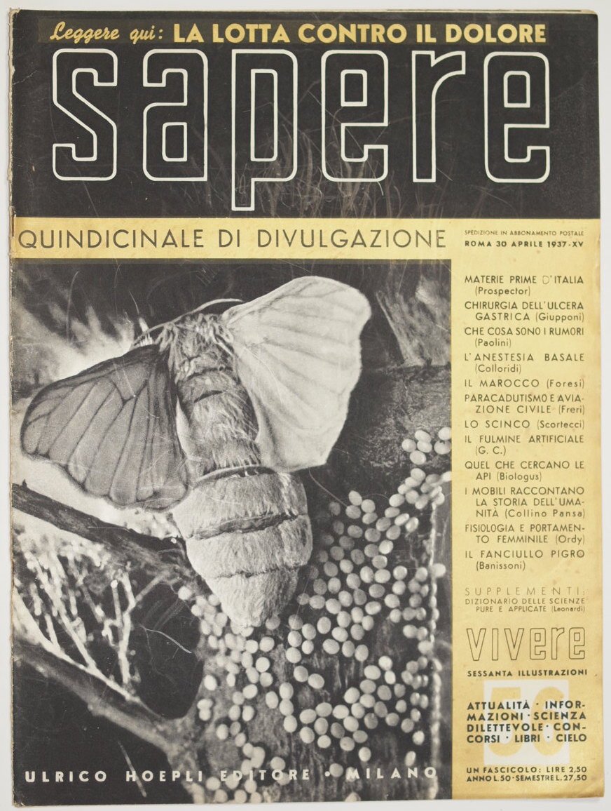 In folio. Dim. 32,5x24,5 cm. Pp. da 245 a 276. Numero del 30 aprile 1937 della piu antica rivista di divulgazione scientifica italiana fondata nel 1935. Tra gli articoli all'interno: Materie prime d'Italia, Rumori, Marocco, Scinco, Fulmine artificiale, eleganza del portamento femminile, Anestesia basale, formaggio, api, paracadutismo e aviazione civile ecc. Numerose foto e illustrazioni all'interno, pubblicita d'epoca (Magnet Marelli, Mobiloil, Esso ecc.). Brossura editoriale originale. Note manoscritte. In buone condizioni. Brossura editoriale in buone condizioni generali con lievi usure ai margini e dorso. Legatura in buone condizioni. Pagine in buone condizioni con rare fioriture. Number of the 30th of april 1937 of the most ancient magazine of scientiphic divulgation established in 1935. Betweent the articles inside: Raw materials of Italy, noises, Marocco, Scinco, Artificial strike, elegance of woman behaviour, Aenestesia, cheese, bees, parachute and civil aviation etc. Different photoes and illustrations inside. Original editorial cover. Handwritten notes. In good conditions. Editorial cover in good general conditions slightly worn in the edges and spine. Foxings. Binding in good conditions. Pages are in good conditions with occasional foxings.