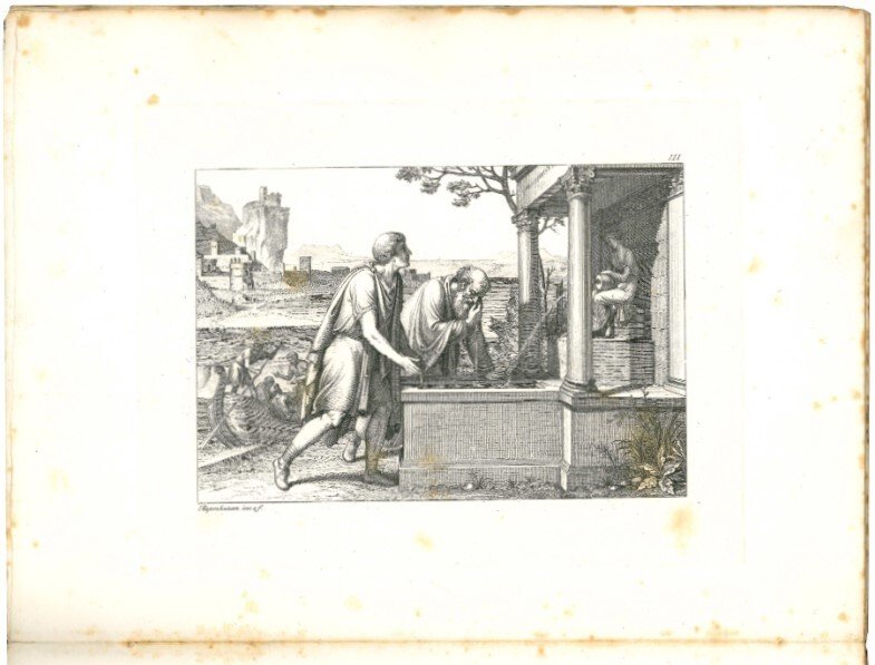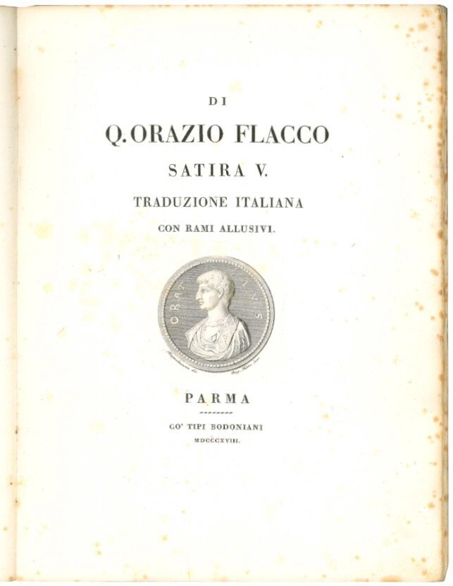 In 4to grande su carta velina (312x231 mm.). [4 cc.], 5 pp., 11 cc. (ultima bianca), e VIII tavole calcografiche numerate fuori testo. Versione italiana in carattere tondo. Ritratto calcografico dell'autore al frontespizio, disegnato da Riepenhausen e intagliato da A. Testa; le incisioni sono disegnate da Riepenhausen e Caracciolo. Dopo il frontespizio presente l'avviso: “L'eccellentissima Signora Duchessa di Devonshire…la Quinta Satira… d'Orazio Flacco, ha mostrato desiderio alla Vedova Bodoni, che comparisse alla luce co' tipi ecc.”. Esemplare in barbe con fioriture diffuse, più forti su alcune carte. Cartonato editoriale, piatto anteriore leggermente macchiato (mancanze al dorso).
