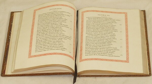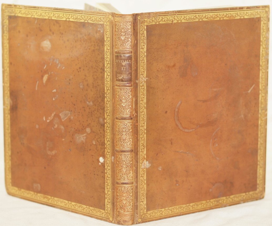 In 4. Dim. 28,5x23 cm. Pp. (186). Pregiata edizione del 1845 di queste due opere di letteratura classica.<BR>Il volume raccoglie le satire di Giovenale e le satire di Aulo Persio Flacco. Testo entro cornice floreale rossa Capilettera decorativi. Carta filigranata di finissima qualità. Tagli in oro. Bellissima legatura in piena pelle coeva di Riviere. La legatoria Bayntun Riviere venne fondata nel 1829 da Robert Riviere e George Bayntun con lo scopo di creare una legatoria all'antica dove i libri venivano rilegati a mano. La stamperia esiste ancora oggi e vanta la più vasta collezione di strumentazione per rilegare i libri a mano. In ottime condizioni. Copertina in piena pelle con decorazioni in oro al dorso e piatti in buone condizioni generali con lievi usure e parti mancanti ai margini e dorso. qualche macchia al piatto anteriore (vedere foto). Legatura in ottime condizioni. All'interno le pagine si presentano in ottime condizioni con rare fioriture. Precious edition of 1845 of these two works of classical litterature. The volume collects satyres ofi Giovenale and of Aulo Persio Flacco. Text in a red flower frame. Decorative initial letters Philigre paper of high quality. Golden external edges of pages. Very beautiful full leather coeval cover bound by Riviere. Bayntun Riviere bounder was established in 1829 by Robert Riviere and George Bayntun with the aim to create a bounder to bind books with the ancient method by hand. The bounder still exists and has the biggest collection of instruments. In very good conditions. Full leather coeval cover with golden title and decorations in the spine and plate in good general conditions slightly worn with missing parts in the edges and spine. Stains in the front plate. Binding in very good conditions. Inside pages are in very good conditions with occasional foxings.
