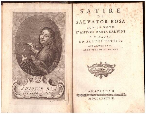 8° (cm. 18,5) mezza pelle 800, pp. XXXV-208. Ritratto dell'Autore inciso in ovale da Giovanni Canocchi all'antiporta. Testatine calcografiche. ll testo è preceduto da una "Vita di Salvator Rosa, celebre pittore e poeta.". Piccola menda al dorso ma buon esempl. Famosa raccolta di satire sulla musica, la poesia, la pittura, la guerra, la Babilonia e l'invidia.