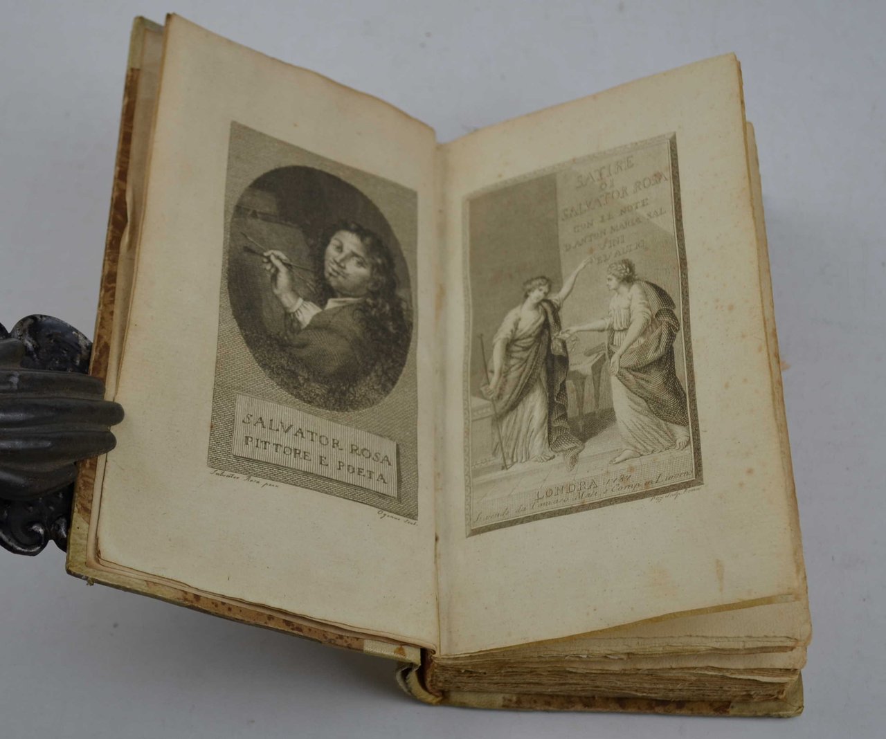 Cm. 17, pp. (4) 333 (1). Bel ritratto all'antiporta e frontespizio figurato. Leg. ottocentesca in mezza pergamena con punte, dorso liscio con titoli in oro su tassello. Esemplare marginoso e ben conservato. Famosa raccolta di satire sulla musica, la poesia, la pittura, la guerra, la Babilonia e l'invidia.