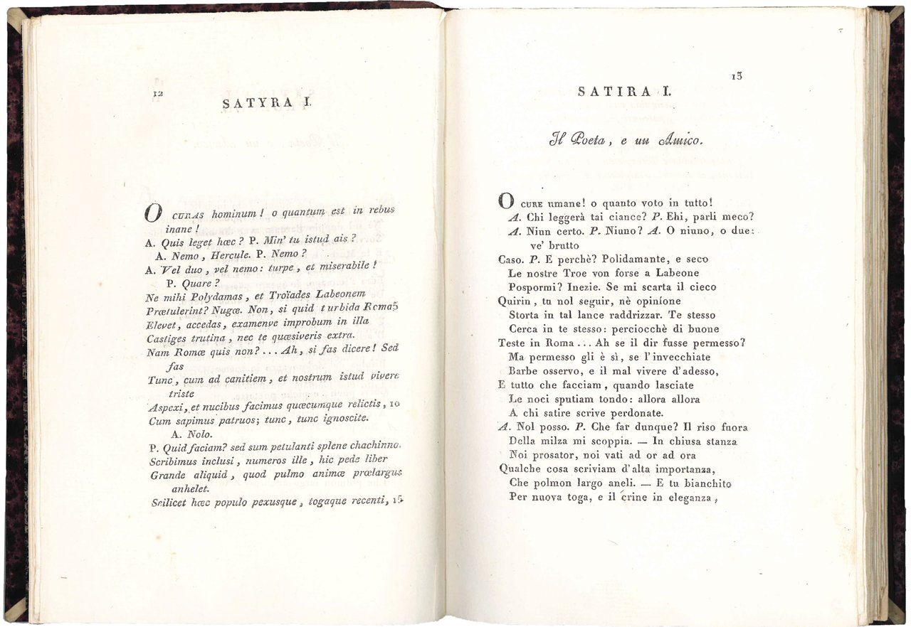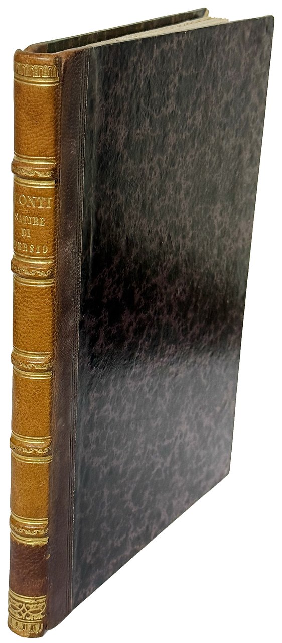 Prima edizione di questa traduzione di sei satire di Persio (con testo latino a fronte), dedicata dal Monti “al cittadino Francesco Melzi d'Eril, Vice-Presidente della Repubblica Italiana”, del quale tesse l'elogio in quanto “Cittadino […] che non prende in sospetto il libero esercizio della ragione; che ama di governare non mandrie, ma uomini”. Le note del Monti occupano le pp. 83-118. “Brillante prova delle capacità tecniche di Monti nelle scelte metriche e lessicali, mentre nelle note si riflette sul rapporto del poeta con il potere, tra denuncia e collaborazione” (G. Izzi, in D.B.I., vol. 76, p. 305). Nello stesso anno il Genio Tipografico ne diede anche un'edizione molto più povera dal punto di vista tipografico e di qualità della carta assai inferiore. In calce al volume sono rilegate cinque carte manoscritte di mano ottocentesca firmate con l'anagramma “P.C.M.P.”, contenenti una dissertazione sul reale significato della parola latina “expers” in Catullo e Persio.