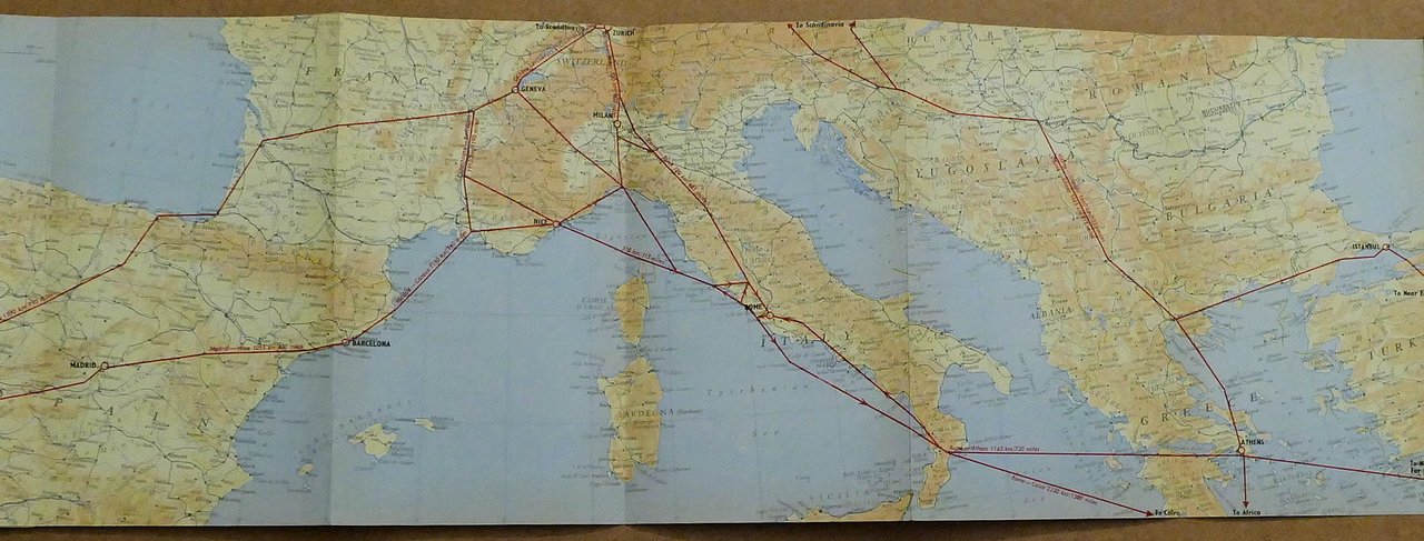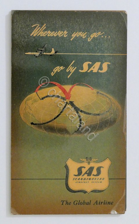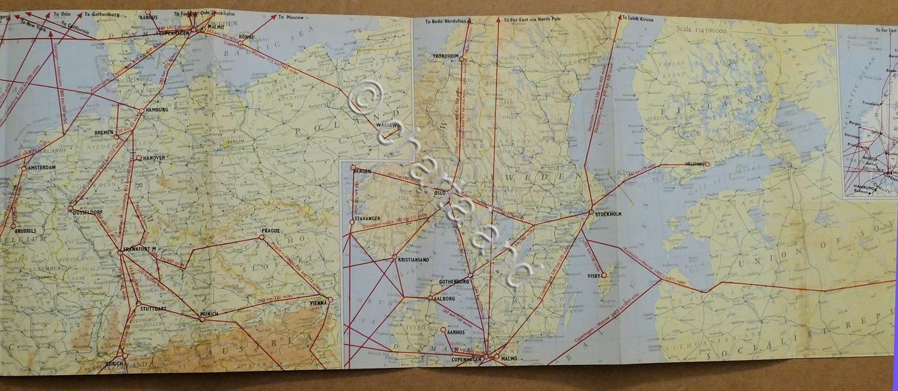 Scandinavian Airlines System - Route map Europe - Mappa Rotte Aeree Europa - anni '60 Stampata fronte retro Dimensioni aperta: 23 x 77 cm ca. Condizioni molto buone.