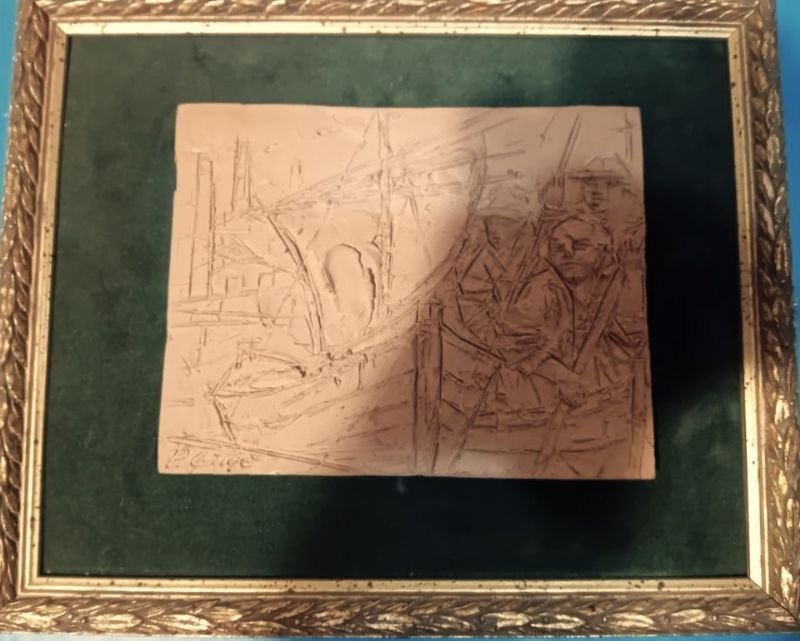 Tavoletta in terracotta, cm. 20x15,5 firmata in basso a sinistra. Raffigurazione di pescatori, con barcone alle spalle e sul fondo costruzioni portuali. Terracotta applicata su velluto verde e con cornice dorata, cm. 33,5x27,5. -(Paolo Grigò, nato a Cascina nel 1954, dopo essersi diplomato all'Istituto Statale d'Arte di Cascina ha proseguito gli studi frequentando corsi accademici d'incisione, ritratto e nudo. Ha collaborato con il padre scultore per apprendere le tecniche di tale disciplina.)