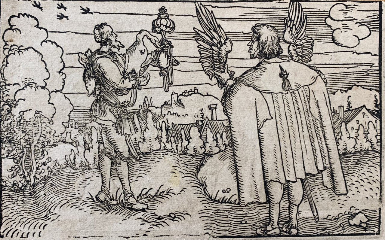 Hans Weiditz è considerato uno dei maestri della xilografia rinascimentale tedesca, insieme a Holbein,  Burgkmair e naturalmente Albrecht Dürer. Viene indicato come  "Il Maestro Petrarca" in ragione delle oltre 250 illustrazioni xilografiche da lui realizzate per il De Remediis Utriusque Fortunae di Petrarca.Quella qui proposta è una delle incisioni appartenenti a questa suggestiva raccolta. xilografia cm. 10,2 x 16 Buono (Good) Buon es., leggere macchie del tempo.