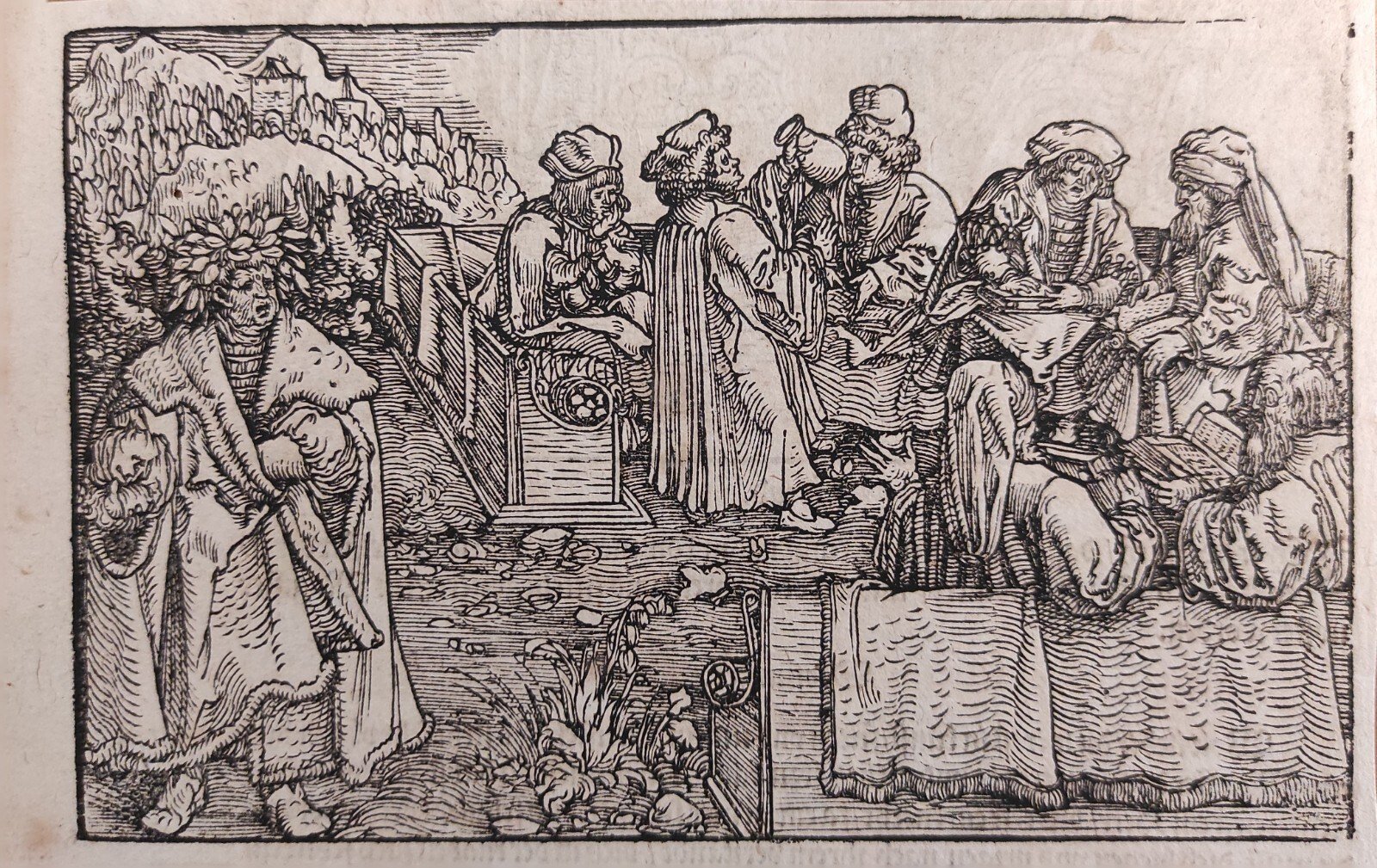 Hans Weiditz è considerato uno dei maestri della xilografia rinascimentale tedesca, insieme a Holbein, Burgkmair e naturalmente Albrecht Dürer. Viene indicato come "Il Maestro Petrarca" in ragione delle oltre 250 illustrazioni xilografiche da lui realizzate per il De Remediis Utriusque Fortunae di Petrarca.Quella qui proposta è una delle incisioni appartenenti a questa suggestiva raccolta. xilografia cm. 10,6 x 16,8 Buono (Good) Buon es..