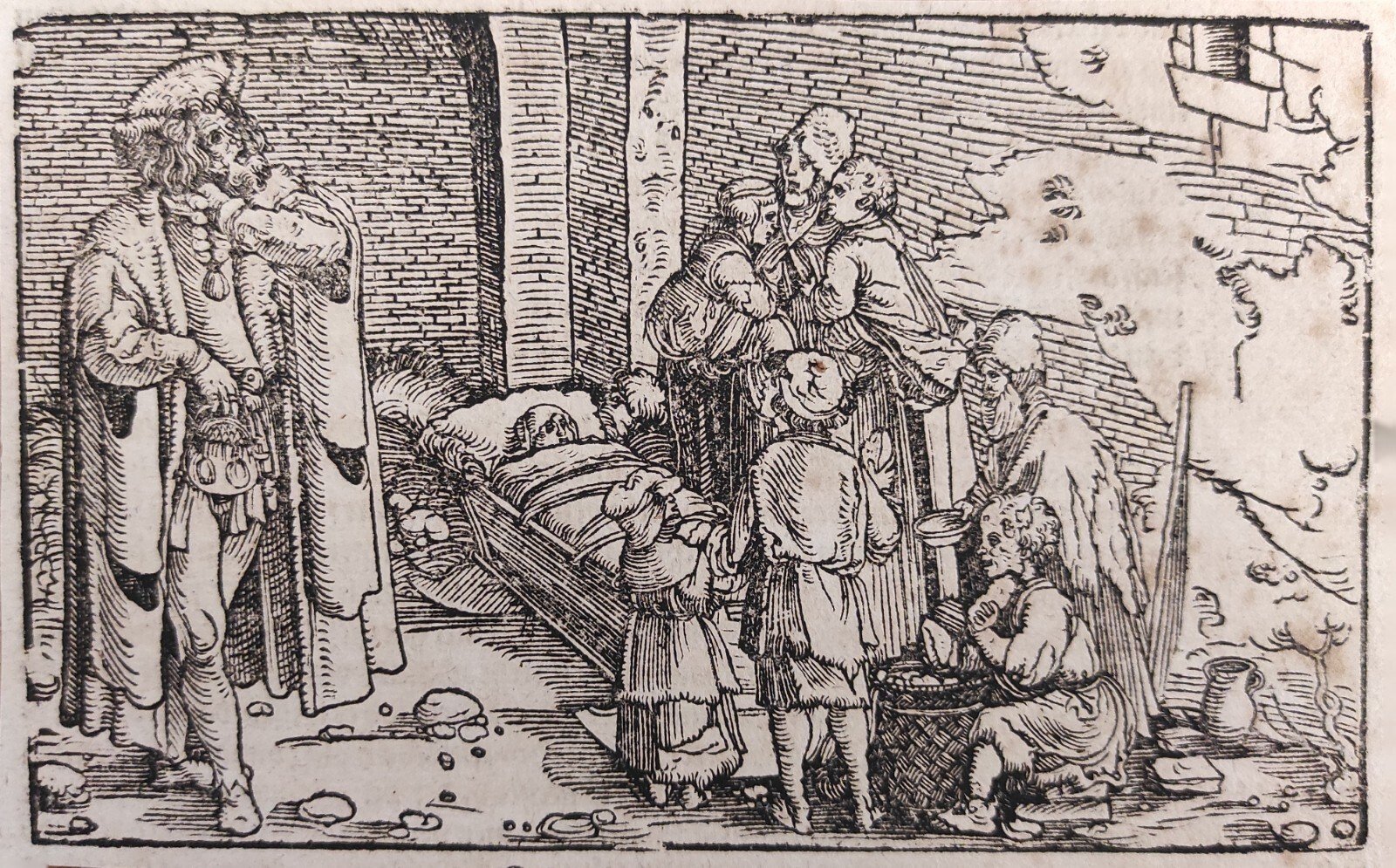 Hans Weiditz è considerato uno dei maestri della xilografia rinascimentale tedesca, insieme a Holbein, Burgkmair e naturalmente Albrecht Dürer. Viene indicato come "Il Maestro Petrarca" in ragione delle oltre 250 illustrazioni xilografiche da lui realizzate per il De Remediis Utriusque Fortunae di Petrarca.Quella qui proposta è una delle incisioni appartenenti a questa suggestiva raccolta. xilografia cm. 10,4 x 16,4 Buono (Good) Buon es., leggere macchie del tempo.