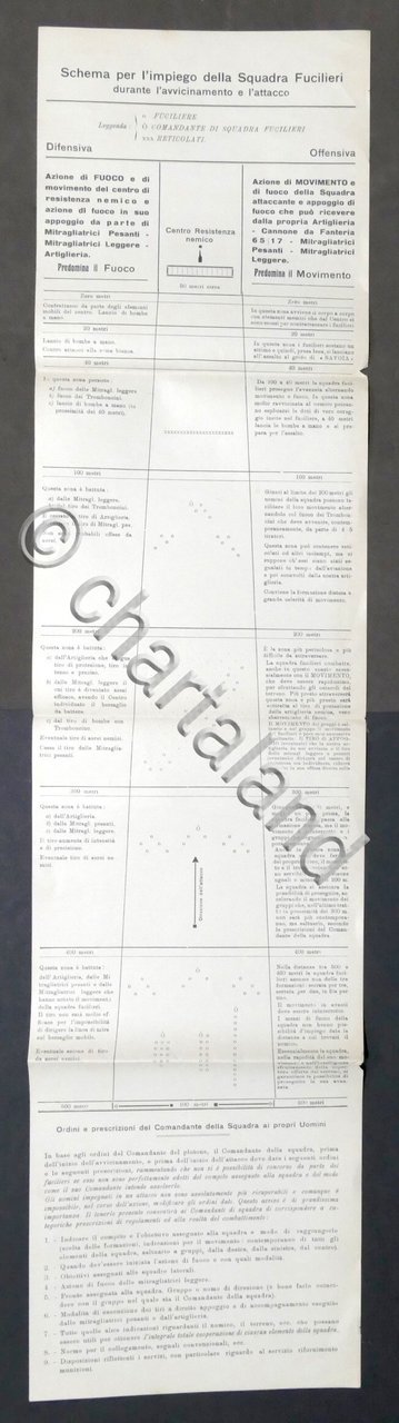 Schema impiego Squadra Fucilieri durante avvicinamento e attacco - anni '30 Un foglio ripiegato, dimensioni: 20 x 84 cm ca. Lingua italiana. Condizioni molto buone.
