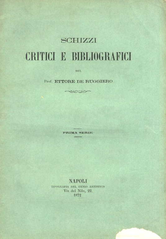Napoli, Tip. del Genio Artistico, 1872, in-8, br. editoriale, pp. 71. Lievi mancanze al dorso e alla cop. anteriore.