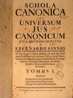 SCHOLA CANONICA SEU UNIVERSUM JUS CANONICUM Nova Methodo Digestum. Tomus I e II. Neo- Pragae, Typis Joannis Nicolai Hampelii 1686.