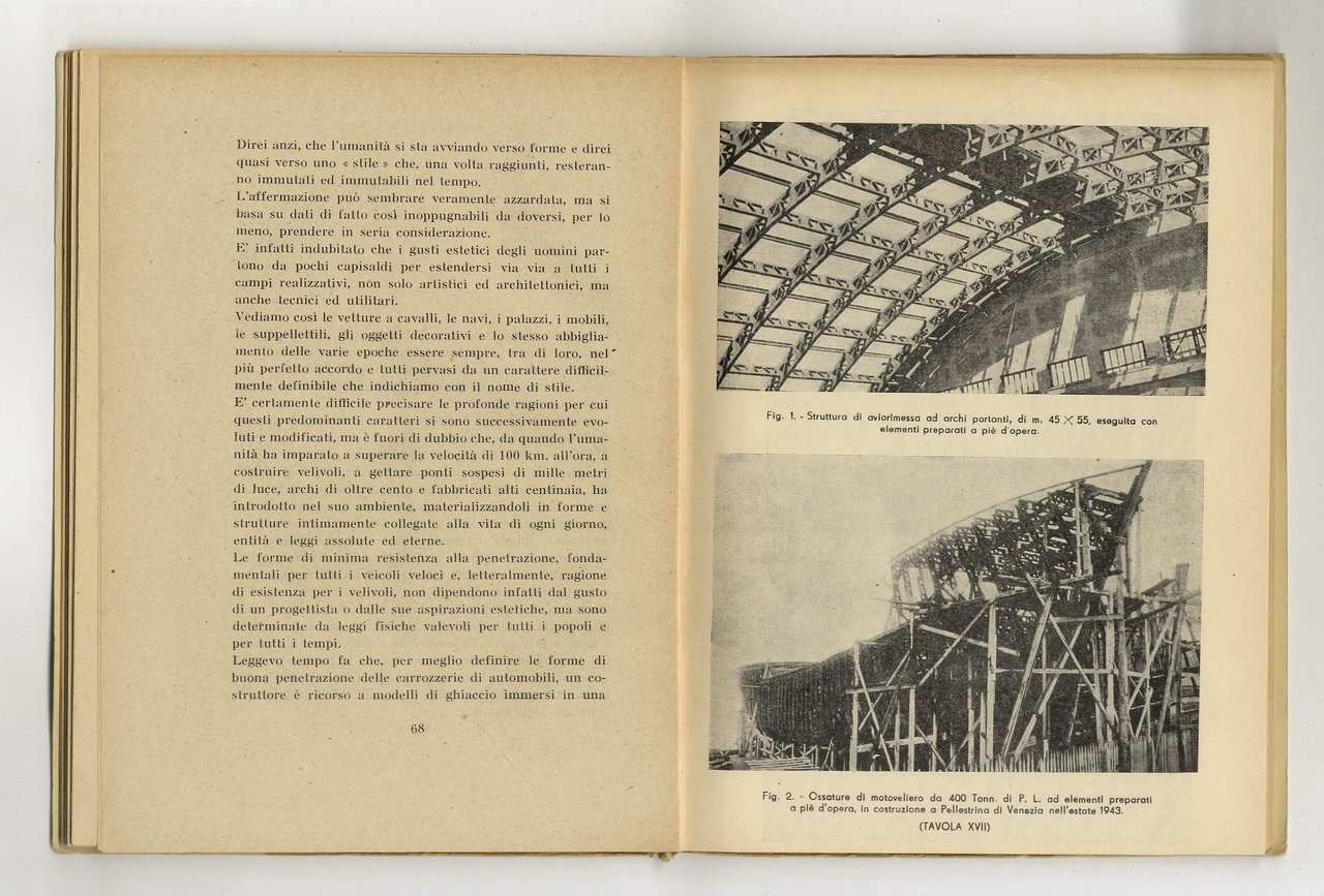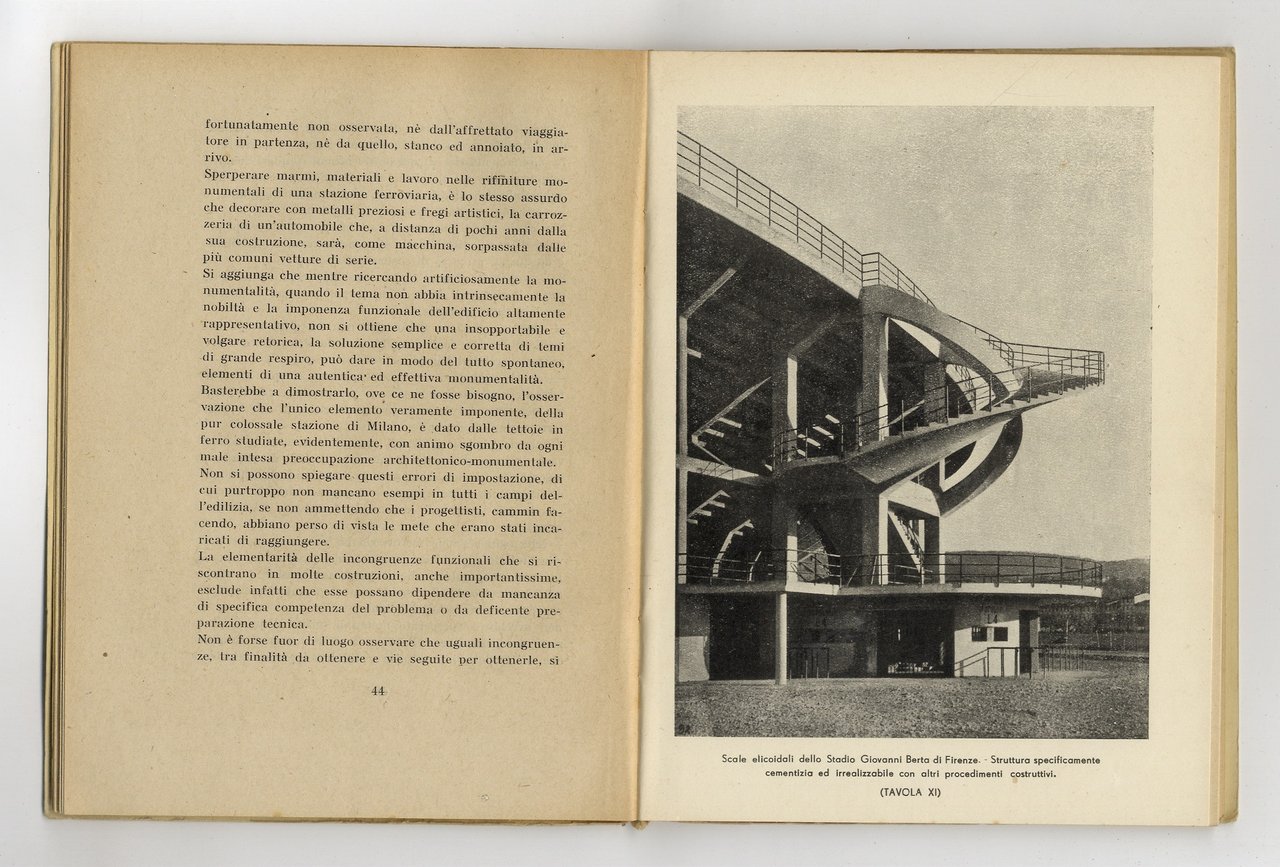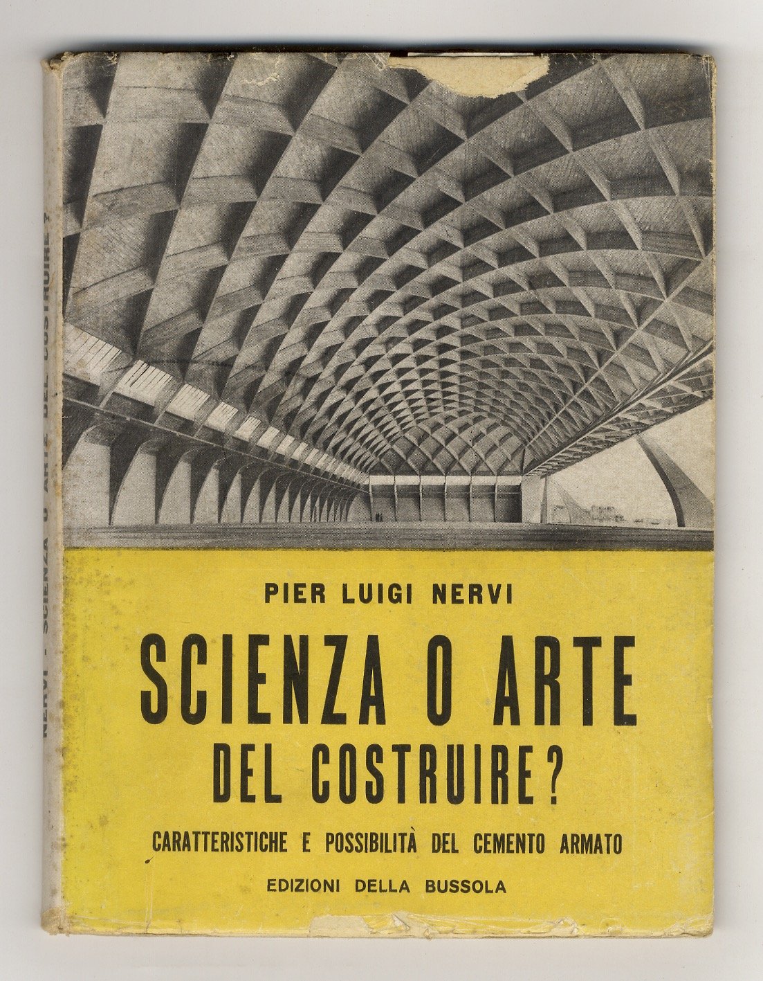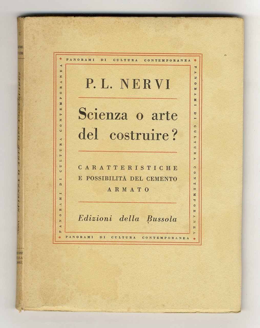 Roma, Edizioni della Bussola, 1945, in-8, brossura editoriale, sovraccoperta illustrata (questa con qualche mancanza marginale), pp. 162, [2]. Con tavole fuori testo. "Panorami di cultura contemporanea", III. Uno dei più significativi testi novecenteschi sul cemento armato e sul rapporto tra questo materiale e le forme architettoniche. Ex-libris. Firma di possesso sul frontespizio.