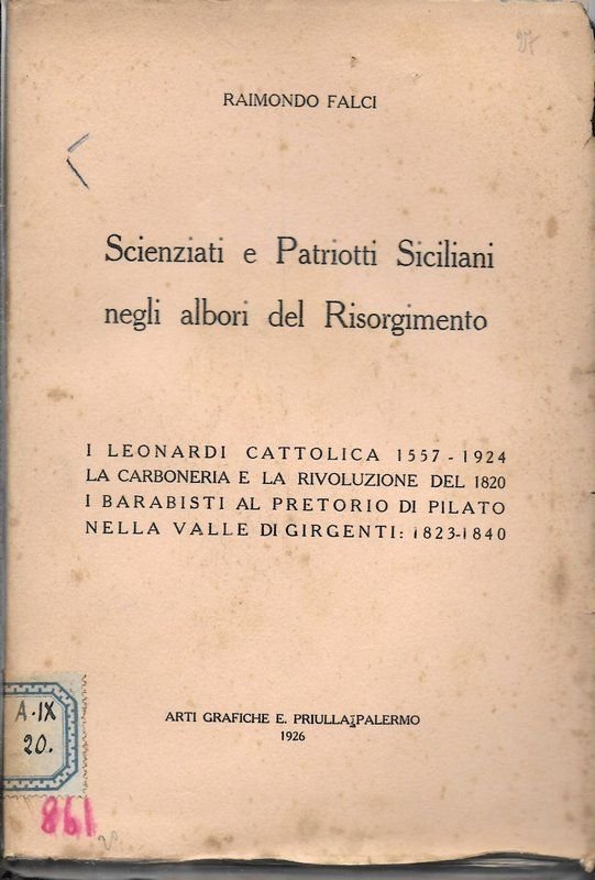 Scienziati e Patriotti Siciliani negli arbori del Risorgimento. I Leonardi Cattolica 1557-1924. - La carboneria e la rivoluzione del 1820. - I Barabisti al Pretorio di PIlato nella Valle di Girgenti: 1823-1840.