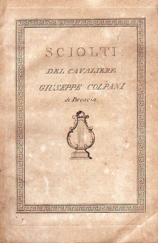 In-8°, legatura in cartonanato alla rustica, pp. (2) 280. Frontespizio inciso, un grazioso capolettera e due raffinate vignette incise da Cagnoni. Comprende varie operette poetiche, tra i titoli:- La Filosofia, Le Comete, La Toeletta, L'Amore, Il Commercio, il gusto e altri vari argomenti - ( Giuseppe Colpani. Brescia, 30 marzo 1738 - 21 maggio 1822). Studiò filosofia e fu professore di belle lettere.Uniformemente brunito il frontespizio e piccole abrasioni alla legatura.