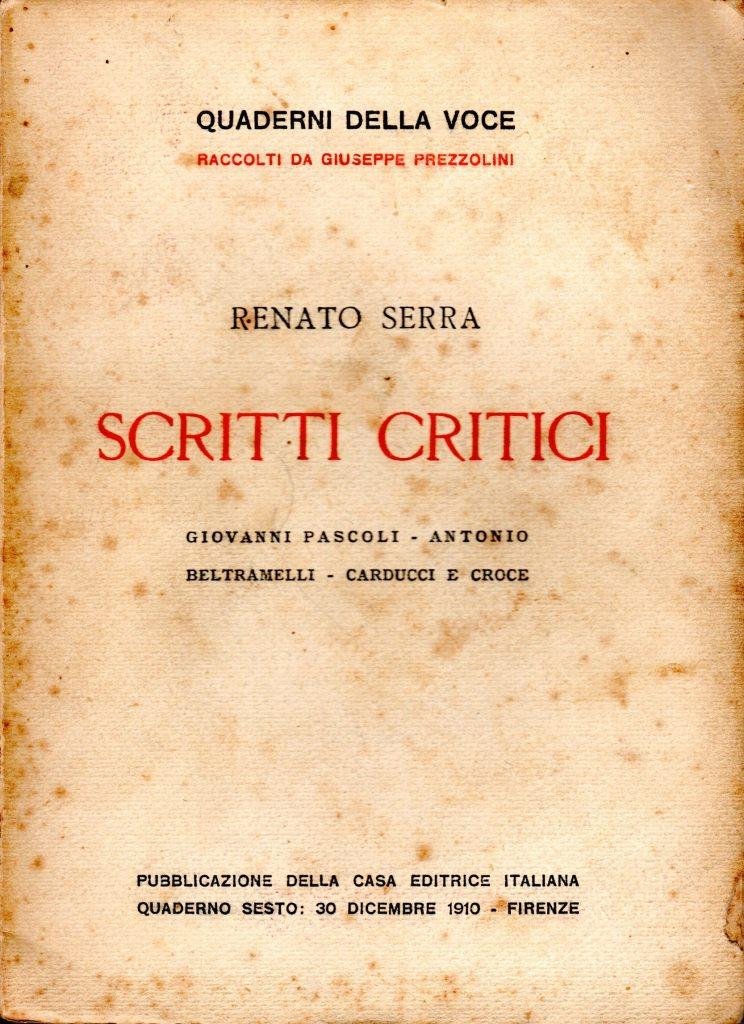 Scritti critici, prima edizione 1910, pp. 113, formato 14 x 19,5.<BR>Copertina morbida di colore beige con titoli in nero e rosso al piatto anteriore e in nero sul dorso. <BR>Fioriture ai piatti e ad alcune pagine. Nel complesso buone condizioni.