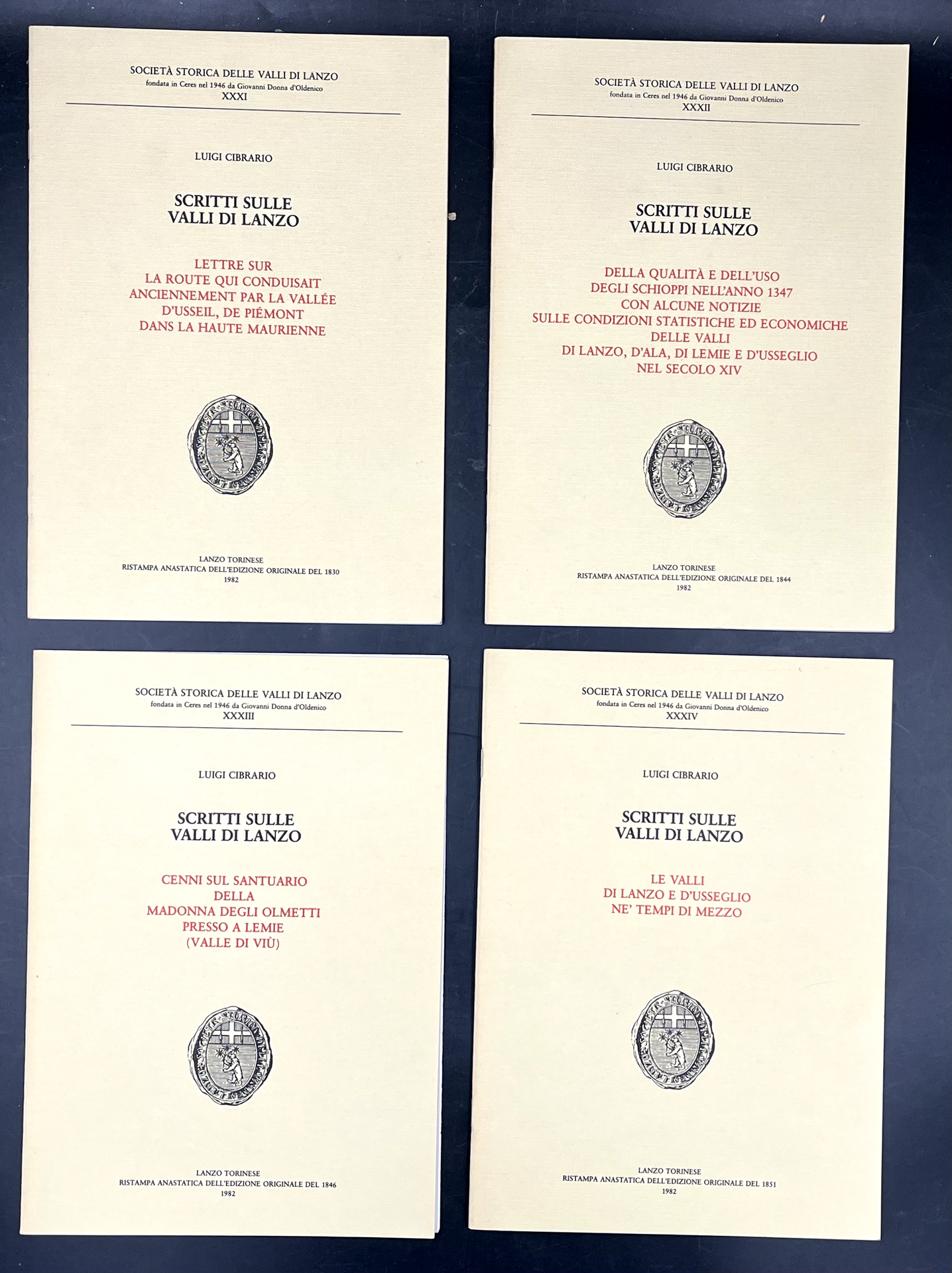 4 fasc. in-8° (cm. 24x17), cartoncino leggero edit. 1) Lettre sur la ROUTE. par la Vallée d'Usseil, de Piémont dans la Haute Maurienne. 1830. 18 pagine. 2) Della qualità e dell'uso degli SCHIOPPI nell'anno 1347 con alcune notizie sulle CONDIZIONI statistiche delle Valli di LANZO, d'ALA, di LEMIE e d'USSEGLIO nel secolo XIV. 1844. Pagine 33, (1) riprodotte con la numerazione originale da p.4 a p. 37). 3) Cenni sul SANTUARIO della MADONNA degli OLMETTI presso LEMIE (Valle di Viù). 1846. pp. 15 numerazione originale da p. 2 a p. 12 + 3 non numerate). 4) Le Valli di LANZO e d'USSEGLIO ne' tempi di mezzo. 1851. Pagine 38 (da p. 286 a p. 323). In eccellenti condizioni, ma esemplari da studio, mancanti del primo foglio non numerato, ma con i TESTI antichi COMPLETI, di sicuro interesse,perchè tratti da opere di ben difficile reperimento. Il lotto dei 4 scritti