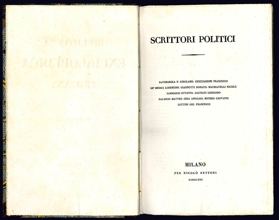 Scrittori politici. Savonarola F. Girolamo. Guicciardini Francesco. De' Medici Lorenzino. Giannotti Donato. Machiavelli Nicolò. Sammarco Ottavio. Salviati Lionardo. Palmieri Matteo. Ceba Ansaldo. Botero Giovanni. Lottini Gio. Francesco.