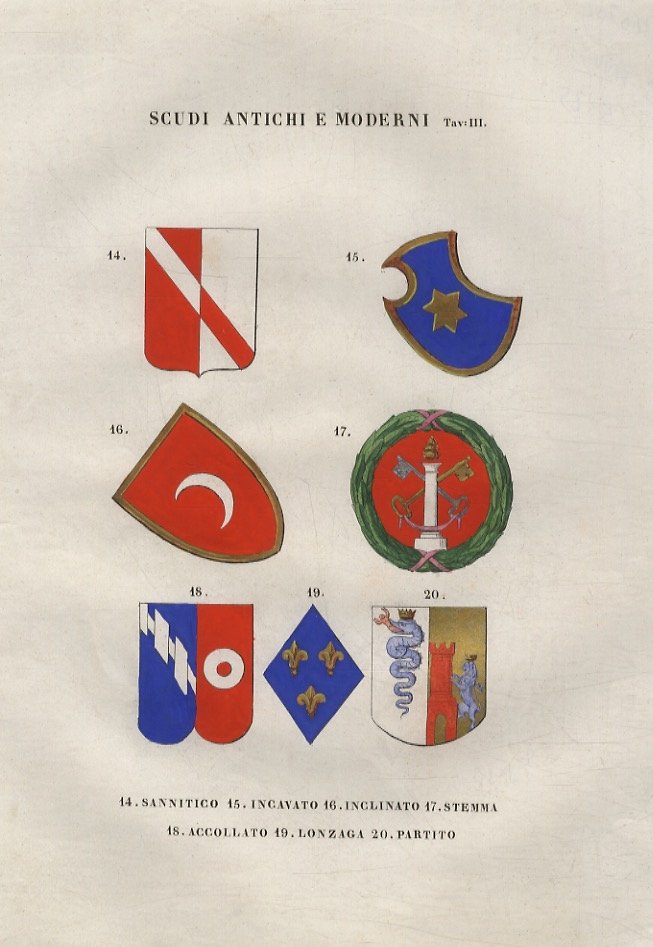 Lodi, Wilmant e figli, 1841-1848, tre tavole in-4, recanti 20 tipologie di stemmi miniati a mano all'epoca, in vividi colori, con particolari argentati e dorati (clipeo, Parma, ancile, pelta, cetra, sannitico, incavato, inclinato, ecc. ecc.). Tratte da "Teatro araldico, ovvero Raccolta generale delle armi ed insegne gentilizie delle più illustri e nobili casate che esisterono un tempo e che tuttora fioriscono in tutta Italia" di Leone Tettoni e F. Saladini, Lodi, Wilmant e figli, 1841-1848. L'insieme: