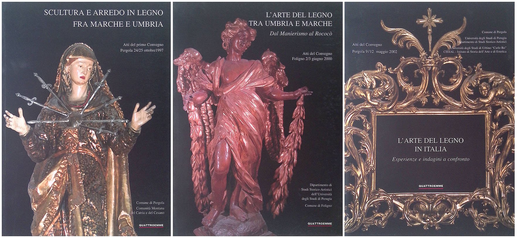 Tre volumi. Vol.I Scultura e arredo in legno fra Marche e Umbria. Pergola 24-25 ottobre 1997. Vol.II L'arte del legno tra Umbria e Marche, Foligno 2-3 giugno 2000. Vol.III L'arte del legno in Italia. Esperienze e indagini a confronto. Pergola 9-12 maggio 2002. 272-302-400 p., f.to cm 29x21, brossura illustrazioni a colori e in b/n. Come nuovo