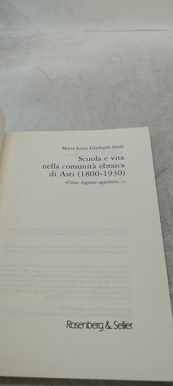 maria luisa giribaldi sardi scuola e vita nella comunità ebraica di asti 1800 1930 come ingenui agnelletti. , rosenberg e sellier 1993 italiano, 191 °°