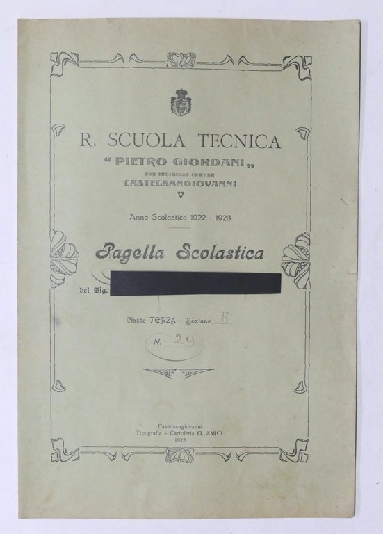 Scuola Tecnica Pietro Giordani - Castel San Giovanni - Pagella classe 3^ - 1922
