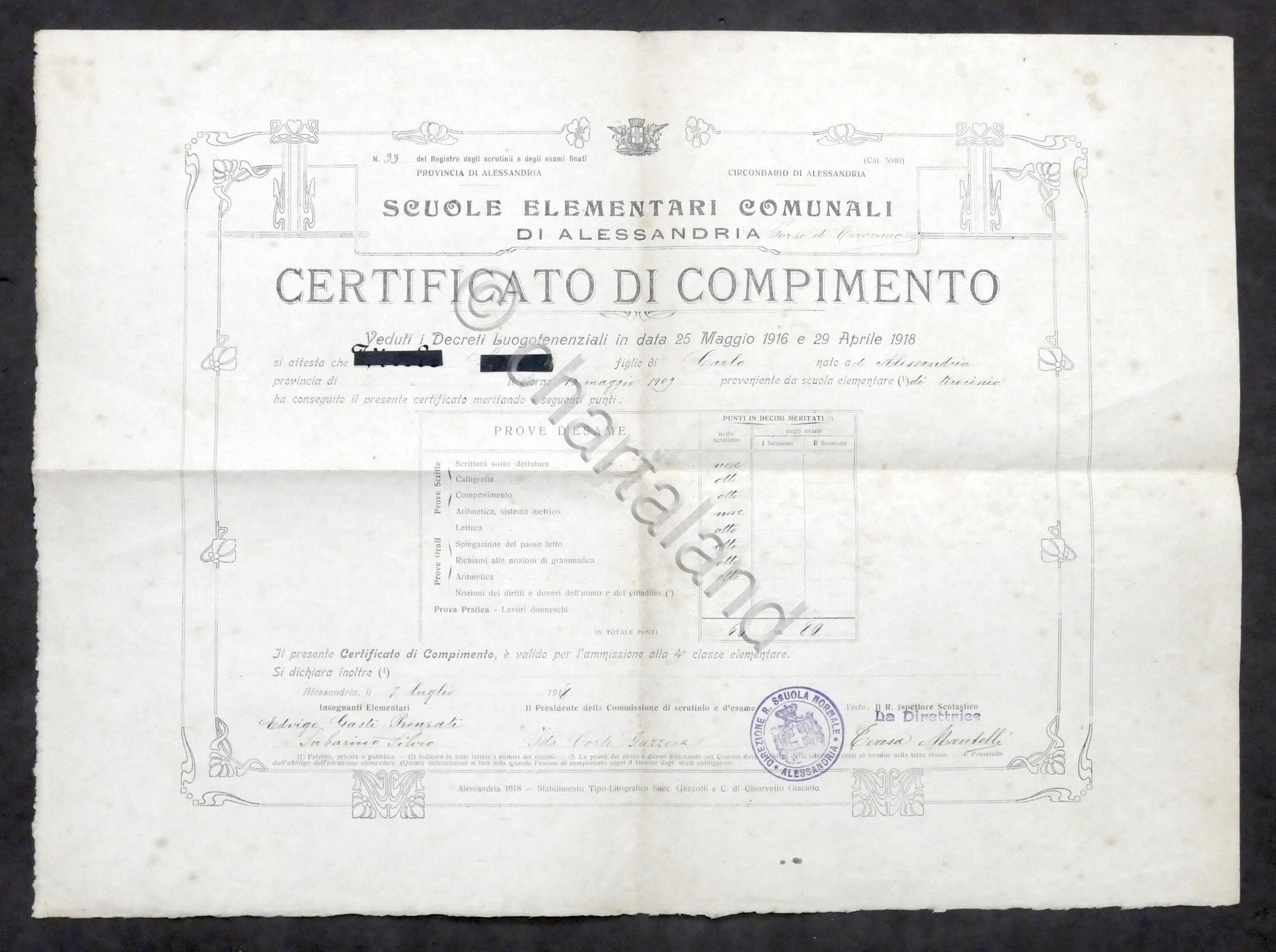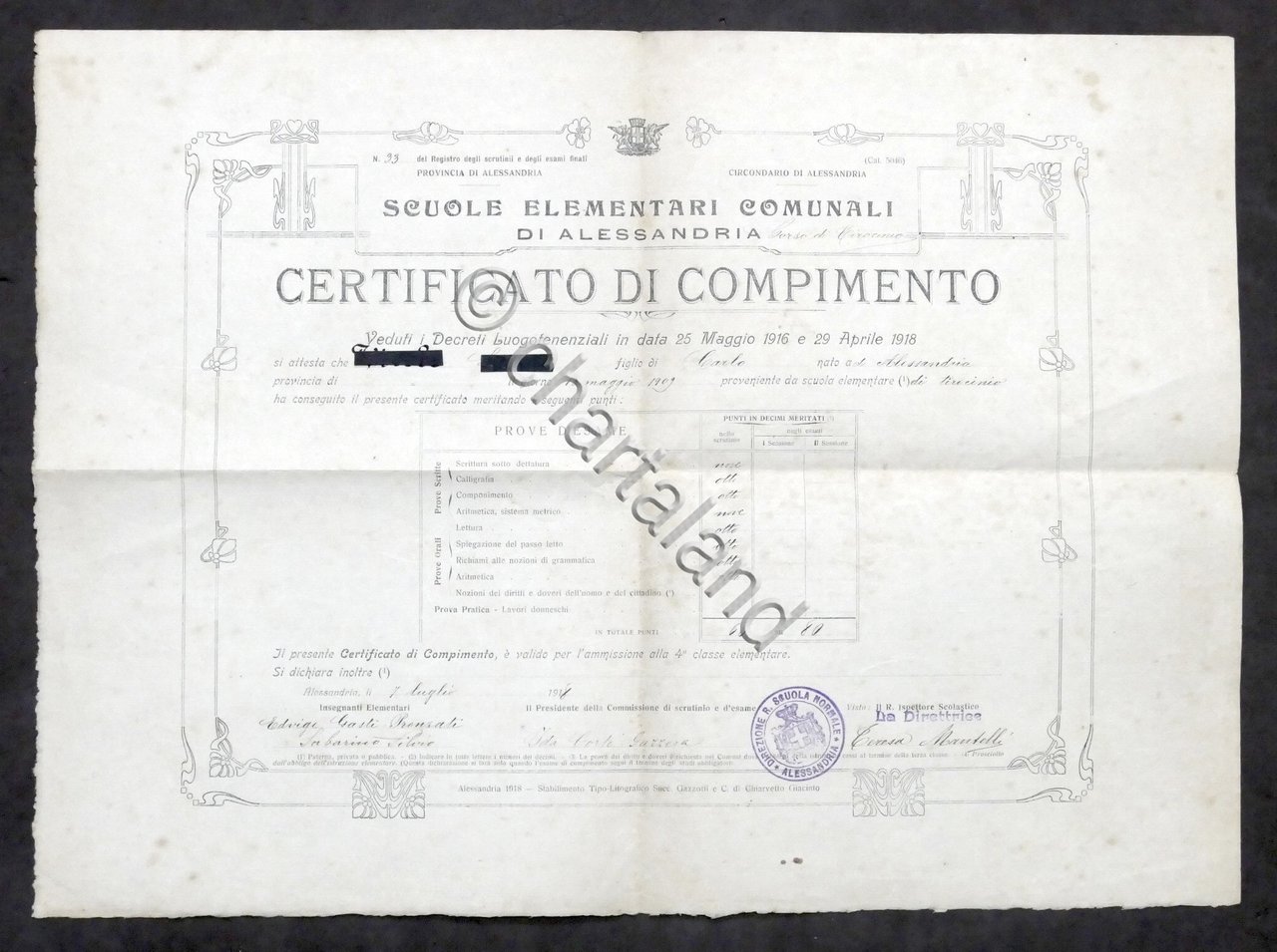 Scuole Elementari Comunali di Alessandria - Certificato di Compimento - 1918 Un foglio ripiegato, dimensioni: 32 x 45 cm ca. Lingua italiana. Condizioni molto buone, come da foto.