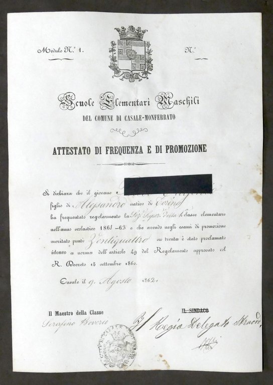 Scuole Elementari Maschili di Casale Monferrato - Attestato di promozione - 1862