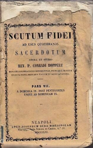 NOVE VOLUMI SU DODICI. Scutum fidei ad usus quotidianos sacerdotum, opera et studio rev. P. Conradi Boppert volumi 1, 2, 3, 4, 5, 6, 7, 8, 10 (mancano il 9, l’11 e il 12). Apud Josephum Dura Bibliopolam, Neapoli, 1856. 414 + 398 + 389 + 406 + 389 + 387 + 404 + 377 + 392 pagine. copertine editoriali in carta. Dimensioni: 10,5 x 16 cm. Stato di conservazione: discreto-buono (mancano alcuni piatti, legature in generale molto allentate, pagine molto impolverate)