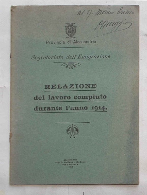 Segretariato dell'Emigrazione. Provincia di Alessandria. Relazione del lavoro compiuto durante l'anno 1914.