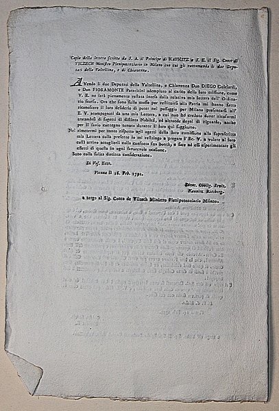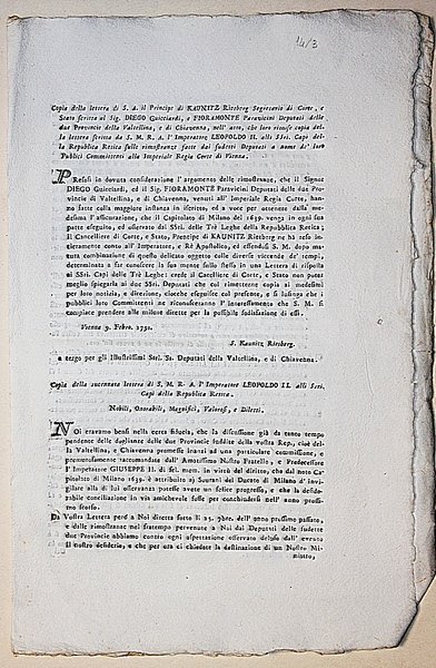 Due cc. in - folio. Buono stato di conservazione. Nel documento a stampa Š contenuta anche copia di una lettera del Kaunitz a Egidio Lavizzari, cancelliere della Valtellina e soprattutto copia di una importante lettera di Leopoldo II concernente problemi amministrativi specie in riferimento ai non facili rapporti di convivenza tra popolazione cattolica e protestante.