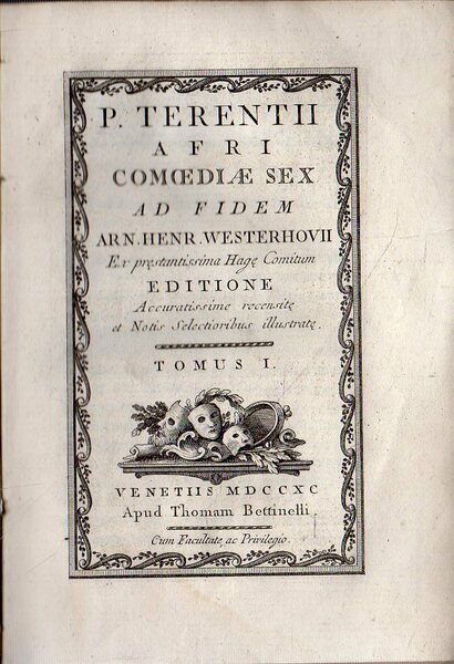 Terenzio. Publio Sei commedie ( 2 tomi). Venezia, Thomam Bettinelli 1790 latin, 2 vol. 1790. Rilegatura in pergamena con rari e lievi segni di umidità, costa leggermente ingiallita. 2 tomi. 18 cm. Ottimo!
