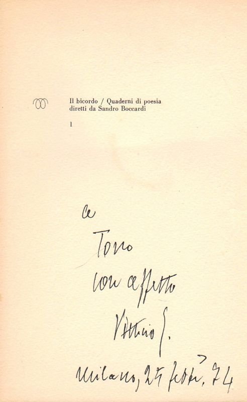 In-8° (cm 21 x 13,5), legatura editoriale in brossura (carta vergellata marrone, con nomi degli autori in bianco e marca tipografica a secco), pp. 30(2); i disegni - a piena pagina o doppia pagina - sono intercalati nel testo. Edizione di 560 copie numerate a mano (n° 294), di cui le prime 60 con un'incisione. Edizione originale, con due poesie inedite e le altre apparse su periodici tra il '69 e il '71. All'occhiello dedica autografa firmata (Vittorio S.) del poeta. Primo dei Quaderni di poesia diretti da Sandro Boccardi - della collana Il bicordo. Conservata la scheda editoriale con nota biografica degli autori. Leggero aloncino al piatto anteriore; altrimenti ottimo esemplare, impreziosito dalla dedica. (Gambetti-Vezzosi, p. 846 'Non comune e abbastanza ricercato')