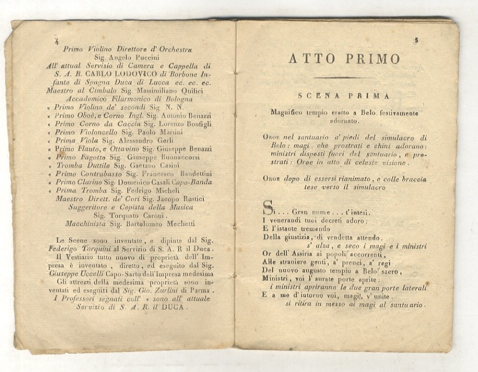 [Lucca], Stamperia Benedini e Rocchi, [1825], in-16, brossura muta coeva (lievi difetti al dorso), pp. 47, [1]. Libretto dell'opera con i nomi dei cantanti, del direttore d'orchestra, degli orchestrali, dello scenografo, del costumista, dell'attrezzista, ecc.