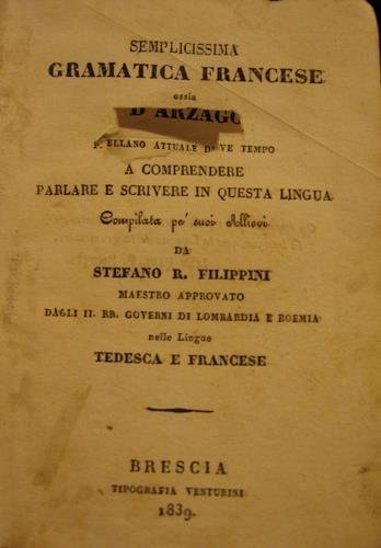 - Libro molto raro e di significativo valore storico. La grammatica è dedicata da Stefano R. Filippini, maestro approvato dagli II. RR. Governi di Lombardia e Boemia nelle Lingue tedesca e francese, all'illustrissimo signore il nobile signor Girolamo de'