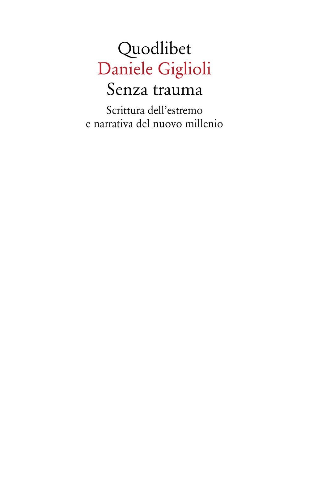 C’è stato un tempo in cui il trauma comportava silenzio, fuga, oblio, dolore e rimozione. Oggi accade il contrario: senza trauma non sappiamo più parlare. Mai la possibilità di subire un trauma nella vita reale è stata tanto messa ai margini come nella nostra epoca. Eppure mai come adesso il trauma viene evocato, desiderato, rivendicato come fattore identitario. Un trauma senza trauma, dunque, o meglio ancora un trauma dell’assenza di trauma: figura di un’impotenza, autodenuncia di una malafede, sintomo di una crisi delle forme e dei linguaggi in cui si riflette e si modella l’esperienza del vivere associato. Qualcosa, in quell’esperienza, fa difetto, e di quel difetto il trauma viene di continuo chiamato a fungere da supplemento, spiegazione, riparazione, motivo non più di vergogna ma di orgoglio. Il saggio di Daniele Giglioli muove dall’ipotesi che molta letteratura del nuovo millennio viva all’insegna di questa situazione: una scrittura dell’estremo che ha nel trauma immaginario la sua prima scaturigine, il suo centro di risonanza più segreto, il suo seme di verità più prezioso. Dei testi convocati a testimoni viene offerta un’analisi puntigliosamente sintomatica, nella convinzione che in una società tutta dedita all’adorazione del feticcio (tra cui quello del trauma senza trauma) e in cui il rapporto con la realtà è interamente requisito dall’immaginario, il sintomo sia già di per sé una critica, un’istanza di verità irriducibile cui bisogna in tutti i modi dare voce.