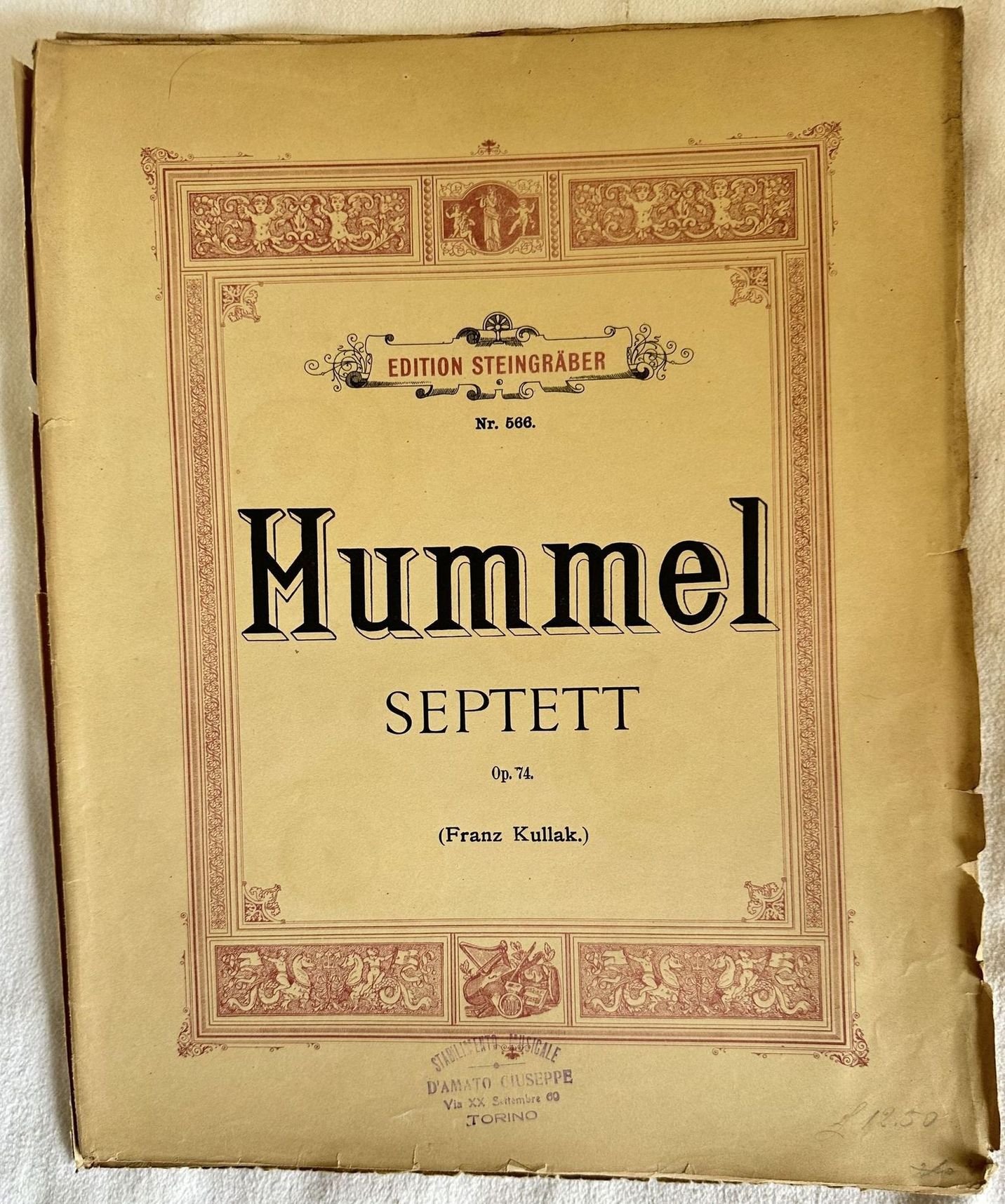 Edizione della fine dell'ottocento della melodia per per due pianoforti "Septett" dall'opera 74 di Johann Nepomuk Hummel (1778-1837) compositore direttore d'orchestra e pianista austriaco. Decorazioni in copertina. In discrete condizioni. Copertina editoriale in discrete condizioni con lievi usure marginali. Piatti staccati. Legatura editorialmente assente. Pagine in buone condizioni con fioriture. In Folio. cm. 34,5x27,5. Pp. 59<BR>Edition of late 19th century of the melody for two pianos "Septett" from the opera 74 by Johann Nepomuk Hummel (1778-1837) composer director of orchestra and piano player. Decorations in the cover. In fair conditions. Editorial cover in fair conditions lightly worn in the extremities. Plates detached. Binding editoriarly lacks. Pages in good conditions with foxing. In Folio. cm. 34,5x27,5. Pp. 59<BR>