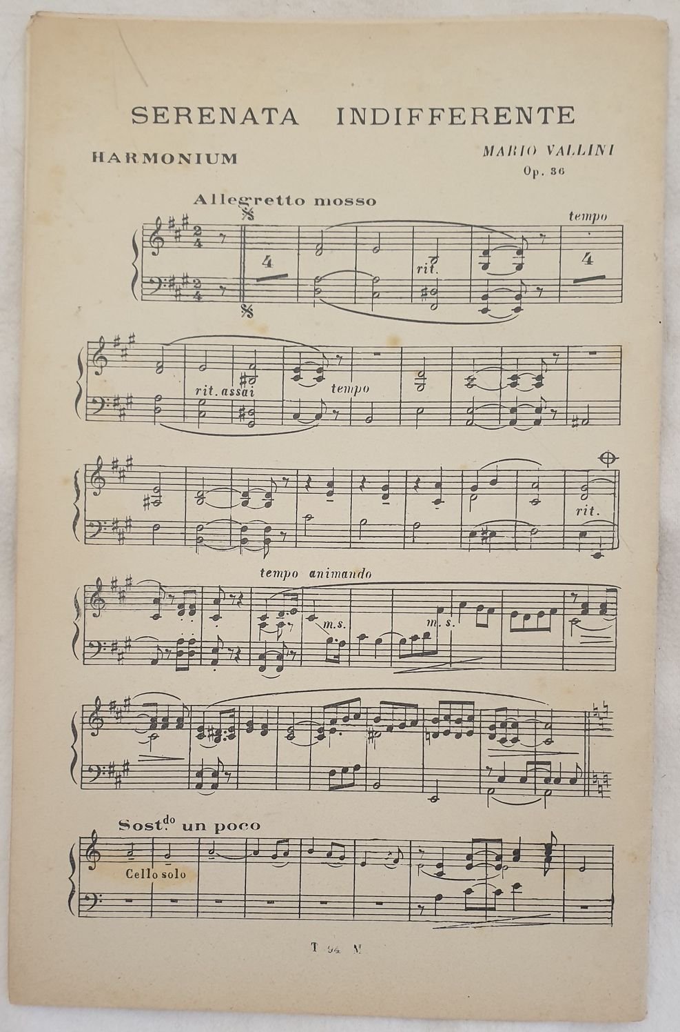 Partitura completa per orchestra del 1929 della melodia "Serenata Indifferente" di Mario Vallini. Copertina assente. GENERE: STRUMENTI: pianoforte, violini; tromba; trombone batteria, clarinetto, flauto ANNO: 1929 DIMENSIONI: In 8. cm 26,5x17,5 PAGINE: pp. 11 CONDIZIONI: Buone condizioni. Copertina assente. Ex libris sulle pagineBeautiful score of two songs of 1929, a complete score for orchestra of the melody "Serenata Indifferente" by Mario Vallini.<BR>STRUMENTI: piano, violins; trumpet; trombone, drums, clarinet, flute <BR>YEAR: 1929 SIZE: In 8. cm 26,5x17,5 PAGES: pp.11 CONDITIONS: Good conditions. Cover lacks<BR>NOTES: Ex libris in the pages