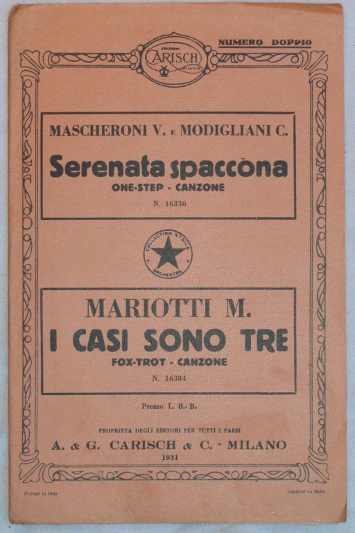 In 8. cm 27,5x18. Pp. 17. Partitura completa per orchestra del 1931 di due canzoni. Caratteristica copertina decorata dell'epoca. Ex libris sulla copertina. Ottime condizioni. A complete score for orchestra of 1931. Carachteristic decorated cover of that period. Ex libris in the cover. Very good conditions.