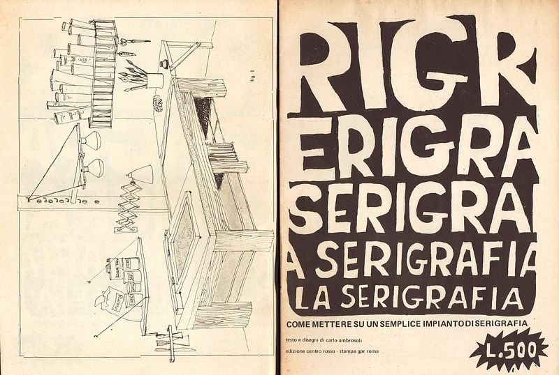 In-8° grande, legatura in brossura editoriale, pp. 14. Spiegazione soprattutto data da disegni pratici dell'autore. (Edizione chiaramente esposta per la formazione di manifesti e illustrazioni anche per muri, per la sinistra militante).
