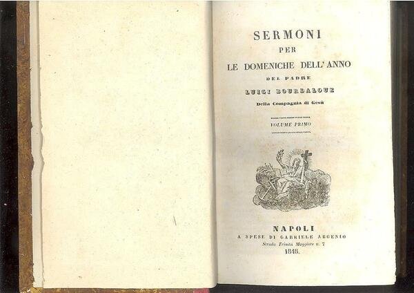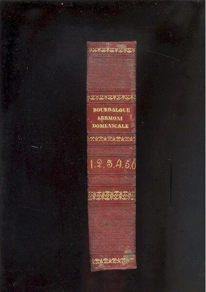 SEI VOLUMI IN 8 RIUNITI IN UNICO TOMO ( cm.23 X 14 ). VOL.1°,pp.121. VOL.2°, pp.118. VOL.3°,<BR>pp.125.VOL.4°, pp.123. VOL.5°,pp.116. VOL.6°, pp.108, INDICI. LEGATURA D'EPOCA IN MEZZA PELLE ROSSA CON TITOLO E FREGI IN ORO, PIATTI MARMORIZZATI. PADRE LUIGI BOURDALOUE ( 1632 - 1704 ), DELLA COMPAGNIA DI GESU'. GESUITA E PREDICATORE FRANCESE, NOTO PER L'ELOQUENZA PROFUSA NEI SERMONI CHE RECITAVA. FU PREDICATORE A CORTE DI LUIGI XIV. VENNE CONSIDERATO COME IL PIU' GIANSENISTRA TRA I MEMBRI SEICENTESCHI DELLA COMPAGNIA DI GESU' E, CONSIDERATO COME IL FONDATORE DELL'ELOQUENZA CRISTIANA IN FRANCIA. OTTIMA CONSERVAZIONE CON<BR>BELLA LEGATURA.ID 4076
