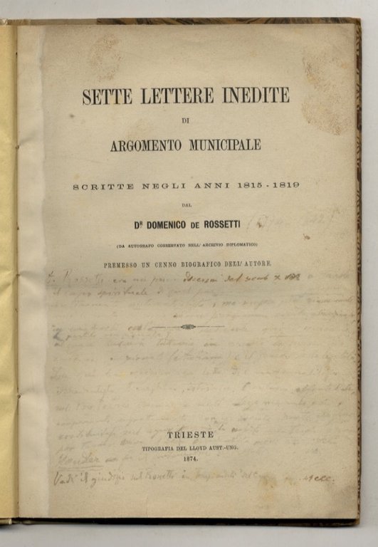 Trieste, Tipografia del Lloyd Aust.-Ung., 1874, in-8, legatura novecentesca in mezza pergamena, piatti rivestiti in carta marmorizzata, pp. [4], XI, [1], 43, [1]. Patriota e letterato (Trieste 1774 - ivi 1842), Rossetti, avverso al dominio francese sulla sua città, subì dure persecuzioni. Firmatario dell'atto comunale del 1818 con cui si richiedeva a Vienna di riconoscere e rinnovare la lealtà all'impero della città, fu strenuo sostenitore dell'autonomia di Trieste. Nel 1810 fondò la Società di Minerva; nel 1829 l'Archeografo triestino. Mise insieme una pregevole raccolta di libri d'interesse petrarchesco, che descrisse in "Petrarca, Giulio Celso e Boccaccio: illustrazione bibliografica" (1828), e curò la pubblicazione delle Poesie minori (3 voll., 1829-34) del poeta. Legò la sua biblioteca a Trieste (Biblioteca Rossettiana). Lunga nota manoscritta (una quindicina di linee) di poco successiva all'edizione, semicancellata sul frontespizio. Rinforzato il margine bianco interno dello stesso frontespizio. Leggero alone al margine bianco interno di alcune carte. Raro.