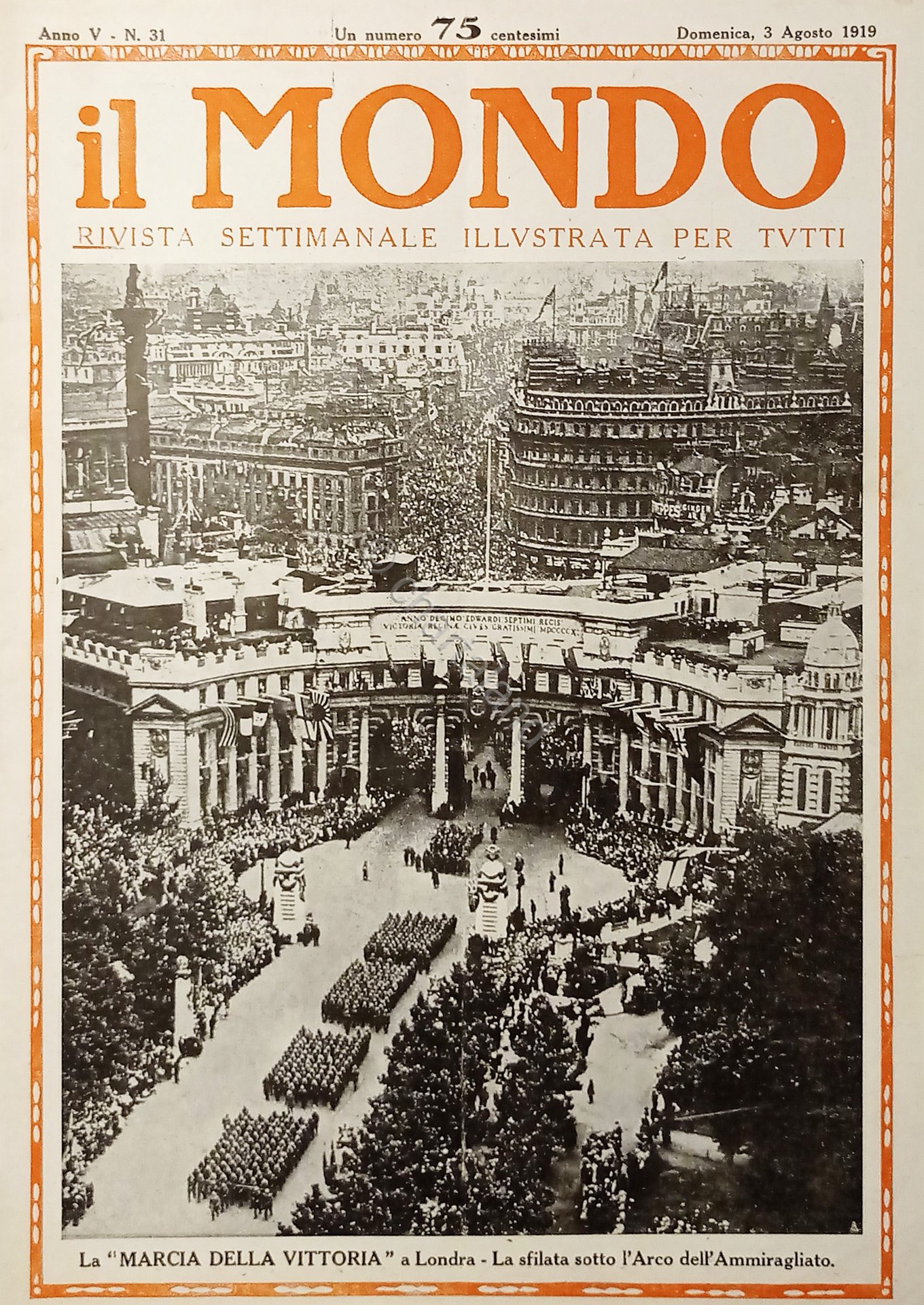 Settimanale - Il Mondo N. 31 - La Marcia della Vittoria a Londra - 1919 Testo in lingua italiana. Pagine 24 con illustrazioni. Condizioni molto buone.