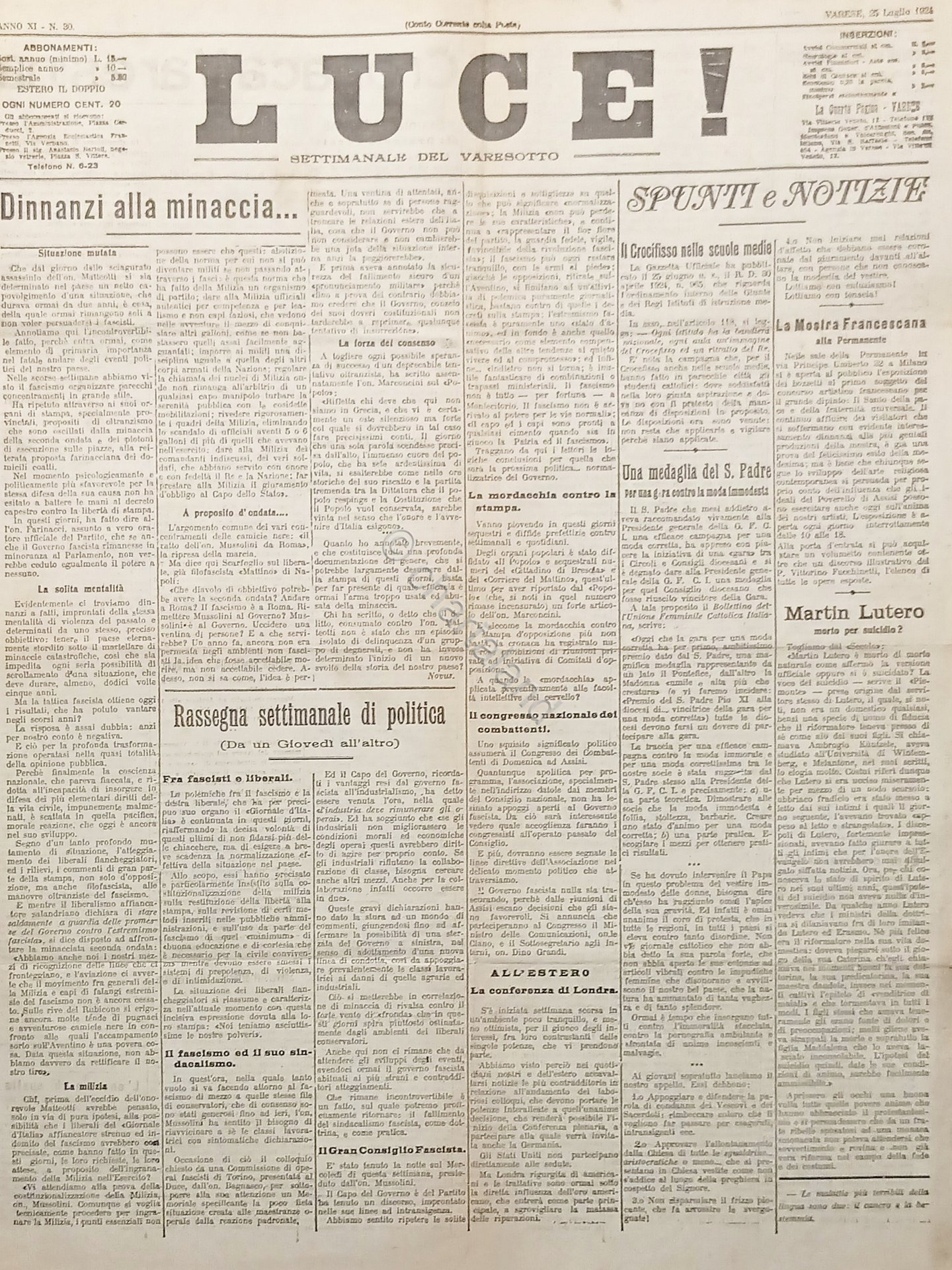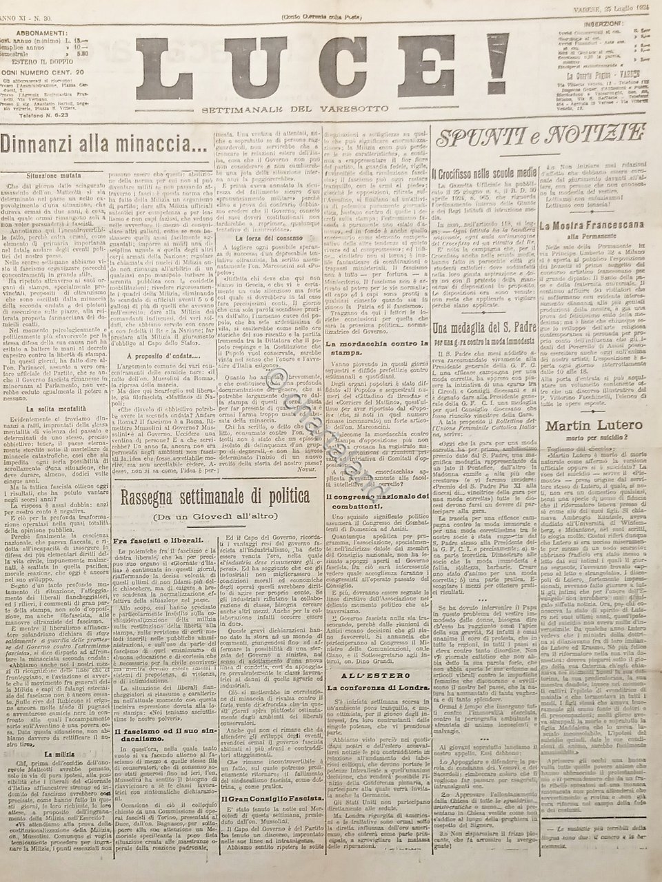 Settimanale del Varesotto - Luce! N. 30 Martin Lutero morto per suicidio? - 1924 Testo in lingua italiana. Pagine 4 con illustrazioni. Condizioni buone con segni del tempo come da foto.