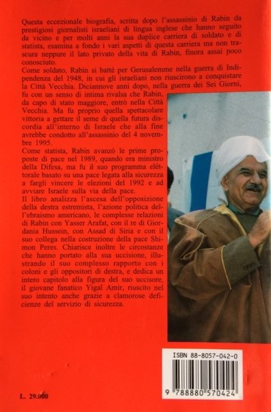 Questa eccezionale biografia, scritta dopo l'assassinio di Rabin da prestigiosi giornalisti israeliani di lingua inglese che hanno seguito da vicino e per molti anni la sua duplice carriera di soldato e di statista, esamina a fondo i vari aspetti di questa carriera ma non trascura neppure il lato privato della vita di Rabin, finora assai poco conosciuto. Come soldato, Rabin si batté per Gerusalemme nella guerra di Indipendenza del 1948, in cui gli israeliani non riuscirono a conquistare la Città Vecchia. Diciannove anni dopo, nella guerra dei Sei Giorni, fu con un senso di intima rivalsa che Rabin, da capo di stato maggiore, entrò nella Città Vecchia. Ma fu proprio quella spettacolare vittoria a gettare il seme di quella futura discordia all'interno di Israele che alla fine avrebbe condotto all'assassinio del 4 novembre 1995. Come statista, Rabin avanzò le prime proposte di pace nel 1989, quando era ministro della Difesa, ma fu il suo programma elettorale basato su una pace legata alla sicurezza a fargli vincere le elezioni del 1992 e ad avviare Israele sulla via della pace. Il libro analizza l'ascesa dell'opposizione della destra estremista, l'azione politica dell'ebraismo americano, le complesse relazioni di Rabin con Yasser Arafat, con il re di Giordania Hussein, con Assad di Siria e con il suo collega nella costruzione della pace Shimon Peres. Chiarisce inoltre le circostanze che hanno portato alla sua uccisione, illustrando il suo complesso rapporto con i coloni e gli oppositori di destra, e dedica un intero capitolo alla figura del suo uccisore, il giovane fanatico Yigal Amir, riuscito nel suo intento anche grazie a clamorose deficienze del servizio di sicurezza. Written by reporters of the magazine Jerusalem report, this biography includes authoritative interviews from those who knew Rabin well on the political, military and personal levels. It highlights his role in the history of modern from a current perspective. included are views on Rabin's ascendancy to icon status after death. (non-fiction category).