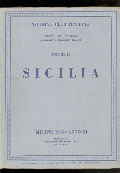 IN 4, pp.254, INDICE. COPERTINA EDITORIALE CON TITOLO ENTRO CORNICE.UNA CARTA A COLORI DELLA SICILIA a pp.f.t. + ALTRE 4 A COLORI ( 2 DI PALERMO, 1 DI MONREALE,1 DI AGRIGENTO ), 389 ILLUSTRAZIONI FOTOGRAFICHE NEL TESTO e f.t. E' IL VOLUME IV DELLE MONOGRAFIE DEL T.C.I. " ATTRAVERSO L'ITALIA ", ILLUSTRAZIONE DELLE REGIONI ITALIANE. PRIMA EDIZIONE DI 420.000 ESEMPLARI IMPRESSI COI TIPI DEL BERTIERI. OTTIMA CONSERVAZIONE. ID 4186