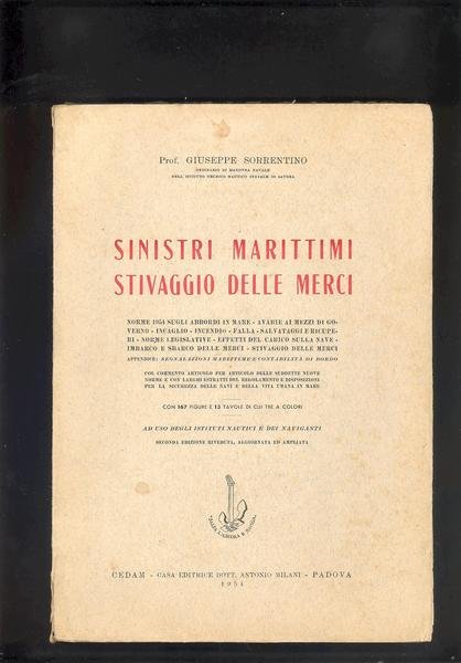 IN 8°, pp.XI, 473. COPERTINA EDITORIALE CON TITOLO IN ROSSO RIPORTATO ANCHE AL DORSO. 167 FIGURE E 13 TAVOLE f.t.RIPIEGATE DI CUI TRE A COLORI. NORME 1954 SUGLI ABBORDI IN MARE - AVARIE AI MEZZI DI GOVERNO - INCAGLIO - INCENDIO - FALLA - SALVATAGGI E RECUPERI - NORME LEGISLATIVE - EFFETTI DEL CARICO SULLE NAVI - IMBARCO E SBARCO DELLE MERCI - STIVAGGIO DELLE MERCI. IN APPENDICE : SEGNALAZIONI MARITTIME E CONTABILITA' DI BORDO. SECONDA EDIZIONE RIVEDUTA, AGGIORNATA ED AMPLIATA. OTTIMA CONSERVAZIONE.