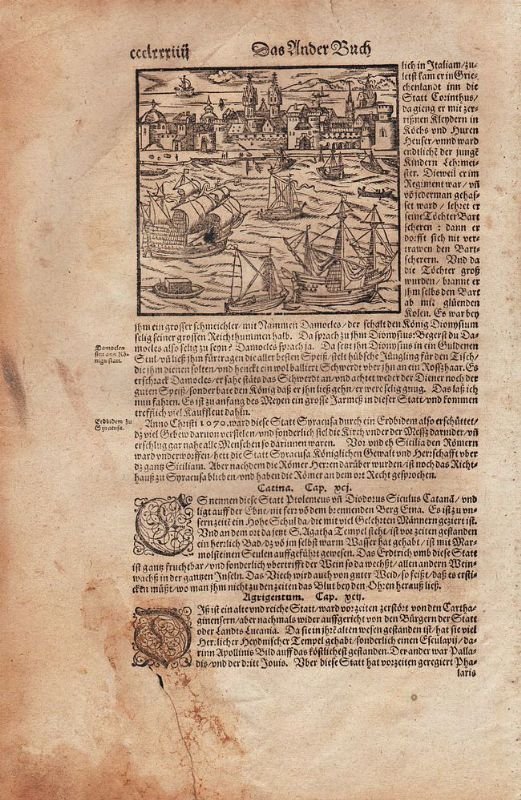 Foglio intero di volume, con 2/3 di testo a stampa e una veduta dal mare , di cm.11x11. Carta uniformemente brunita e strappo nel margine inferiore bianco.