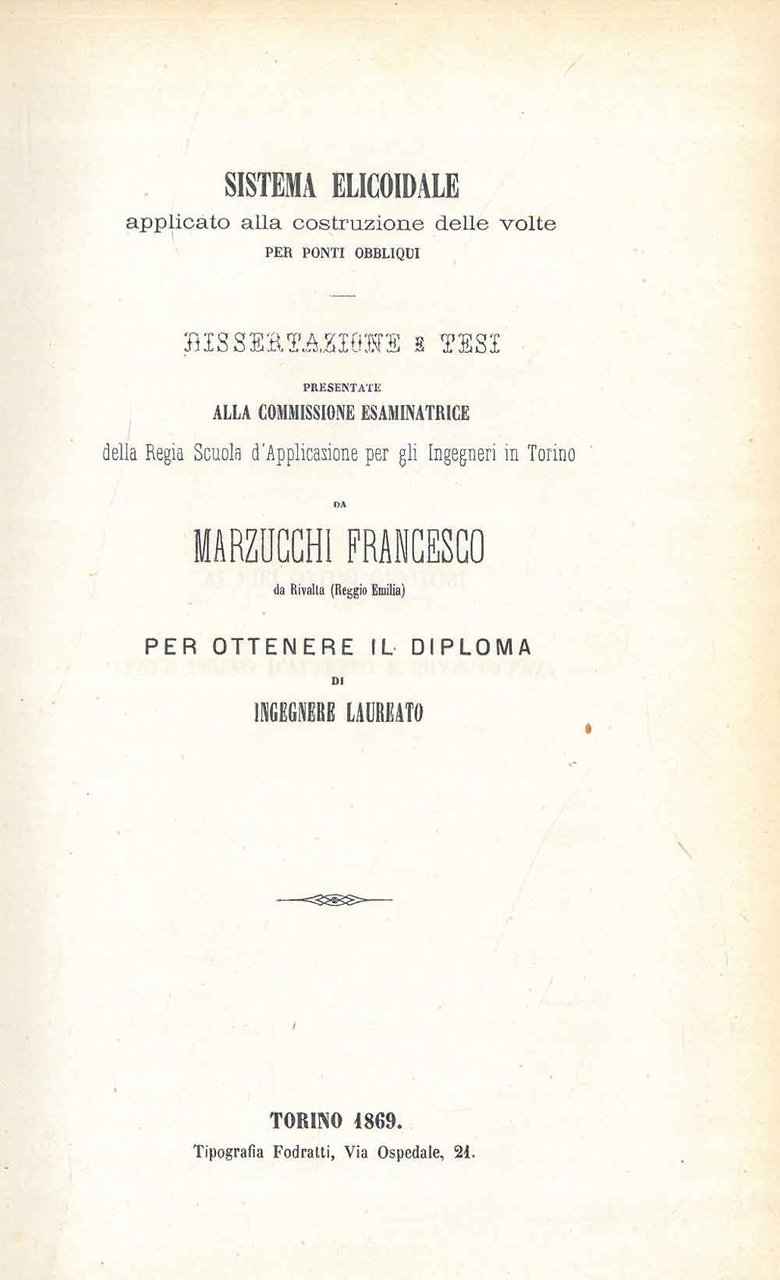 Sistema elicoidale applicato alla costruzione delle volte per ponti obbliqui. Dissertazione e tesi presentate alla commissione esaminatrice della Regia scuola d'applicazione per gli ingegneri in Torino .
