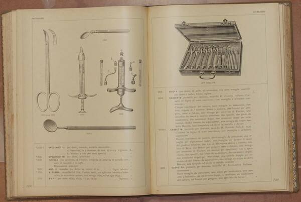 In 4. Dim. 28x21 cm. Pp. XXXIX+413+(1). Interessante catalogo del 1940 di strumenti e arredi sanitari della Società Anonima Ernesto Invernizzi fornitrice della Real Casa, Rr. Ministeri, Rr. Cliniche, Croce Rossa italiana, Cavalieri di Malta, Ferrovie dello Stato, Ospedali civili e militari, Luoghi pii, Istituti e gabinetti scientifici. All'interno descizione con relativa illustrazione di numerosi strumenti e apparecchi diagnostici, ascolto, pr la misura della pressione, termometri, esame del sangue, del latte, delle orine, apparato digerente, biopsie, centrifughe, trasfusione del sangue, Strumenti e apparecchi per microscopia, Accessori per bagnomaria, stufe, lampade, Siringhe, Vetri, Apparecchi per sterilizzazione, Strumenti per anestesia, Siringhe ed aghi per iniezioni, suture, gessature, elettroterapia, cauteri, Interventi chirurgici, Salassi e vaccinazione, dermatologia, oculistica, orecchio, otorinolaringoiatria, denti, esofago, Chirurgia gastro intestinale, ernie, fegato, urologia, Ginecologia, Ostetricia, amputazione, resezione, per l'estrazione dei proiettili, Autopsia, Apparecchi ortopedici, Protesi, Ortopedia, Camere operatorie ecc. Copertina in tela editoriale. In buone condizioni. Copertina in tela editoriale in buone condizioni generali con lievi usure ai margini e dorso. Legatura in buone condizioni. Lieve rottura all'ultima pagina di sguardia. All'interno le pagine si presentano in buone condizioni con fioriture. Piegature alla prima pagina di sguardia. Interesting catalogue of 1940 of medicine instruments and health furniture of the Società Anonima Ernesto Invernizzi provider of the Real Casa, Rr. Ministeri, Rr. Cliniche, Croce Rossa italiana, Cavalieri di Malta, Ferrovie dello Stato, Ospedali civili e militari, Luoghi pii, Istituti e gabinetti scientifici. Inside description with relating illustration of different instruments and diagnostic tools, hearing, measure of pression, termometers, examination of blood, of milk, orines, digestive, biopsy, transfusion of blood, instruments and tools for microscopes, Lamps, Syringes, Tools for sterilization, Instruments for anesthesia, syringes and needles for injection, electrotherapy, Surgical interventions, Vaccination and bleeding, dermatology, oculistics, ear, ears and mouth, teeth, Surgery of stomach, ernie, liver urology, Ginecology, Obstetrics, cutting, extraction of bullets, Autopsy, Ortopedical tools, Protesis, Orthopedy, Surgical rooms etc. Editorial cloth cover. In good conditions Cloth editrial cover in good general conditions slightly worn in the edges and spine. Binding in good conditions but slight crack in the last endpage. Inside pages are in good conditions with foxings. Foldings in the first endpage.